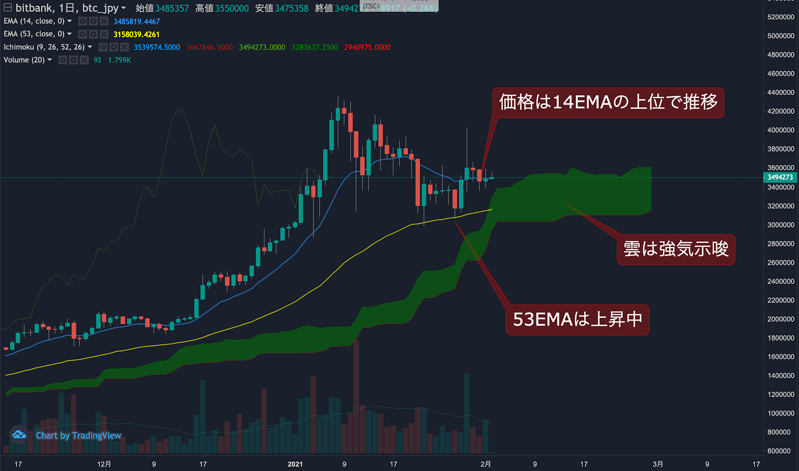 昨日のビットコイン(BTC)の日足終値は、前日から0.8%上昇した348.5万円でした。価格は14EMA(348.4万円)を上回り強気示唆です。53EMA(314.5万円)は上昇中で長期トレンドも強気です。一目均衡表の雲は先行スパン1(360.3万円)が先行スパン2(311.4万円)を上回り強気示唆です。