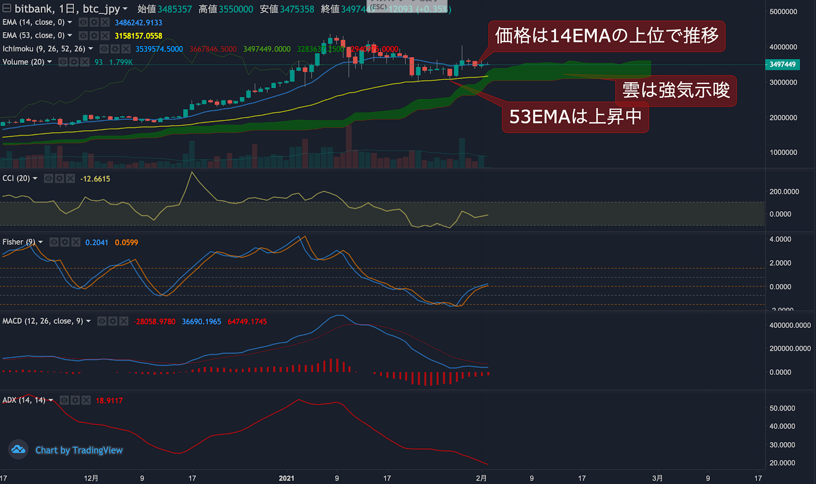 2月1日のビットコインの日足終値は移動平均線を上回り強気トレンドを示唆し、オシレーターのFisherとMACDがプラス域で推移しておりこれをコンファームしています。
