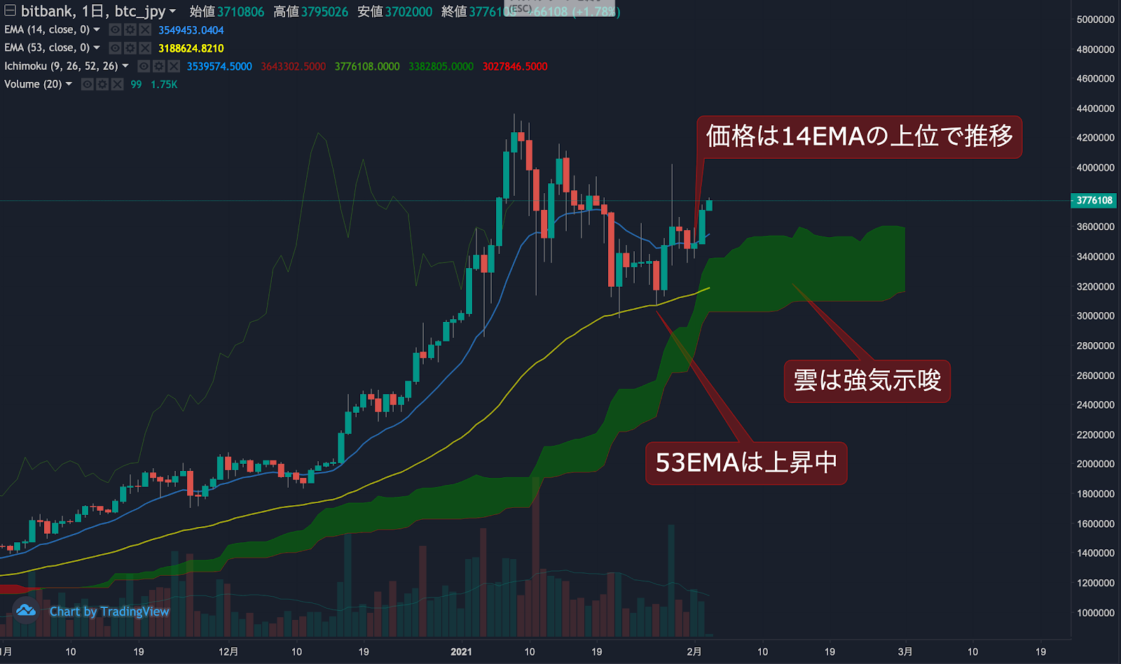 昨日のビットコイン(BTC)の日足終値は、前日から6.4%上昇した371.0万円でした。価格は14EMA(351.4万円)を上回り強気示唆です。53EMA(316.6万円)は上昇中で長期トレンドも強気です。一目均衡表の雲は先行スパン1(360.3万円)が先行スパン2(315.2万円)を上回り強気示唆です。