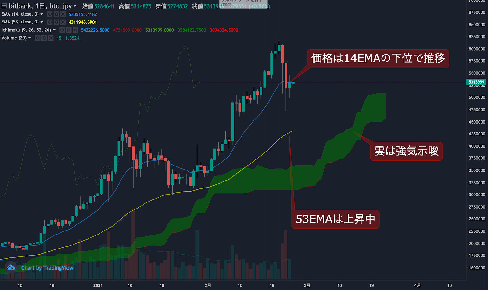 昨日のビットコイン(BTC)の日足終値は、前日から13.2%下落した319.9万円でした。価格は14EMA(364.2万円)を下回り弱気示唆です。53EMA(300.2万円)は上昇中で長期トレンドは強気です。一目均衡表の雲は先行スパン1(357.5万円)が先行スパン2(309.4万円)を上回り強気示唆です。