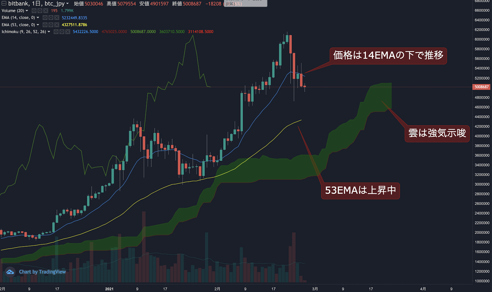 昨日のビットコイン(BTC)の日足終値は、前日から4.8%下落した502.6万円でした。価格は14EMA(526.6万円)を下回り弱気示唆です。53EMA(432.4万円)は上昇中で長期トレンドは強気です。一目均衡表の雲は先行スパン1(509.1万円)が先行スパン2(456.4万円)を上回り強気示唆です。