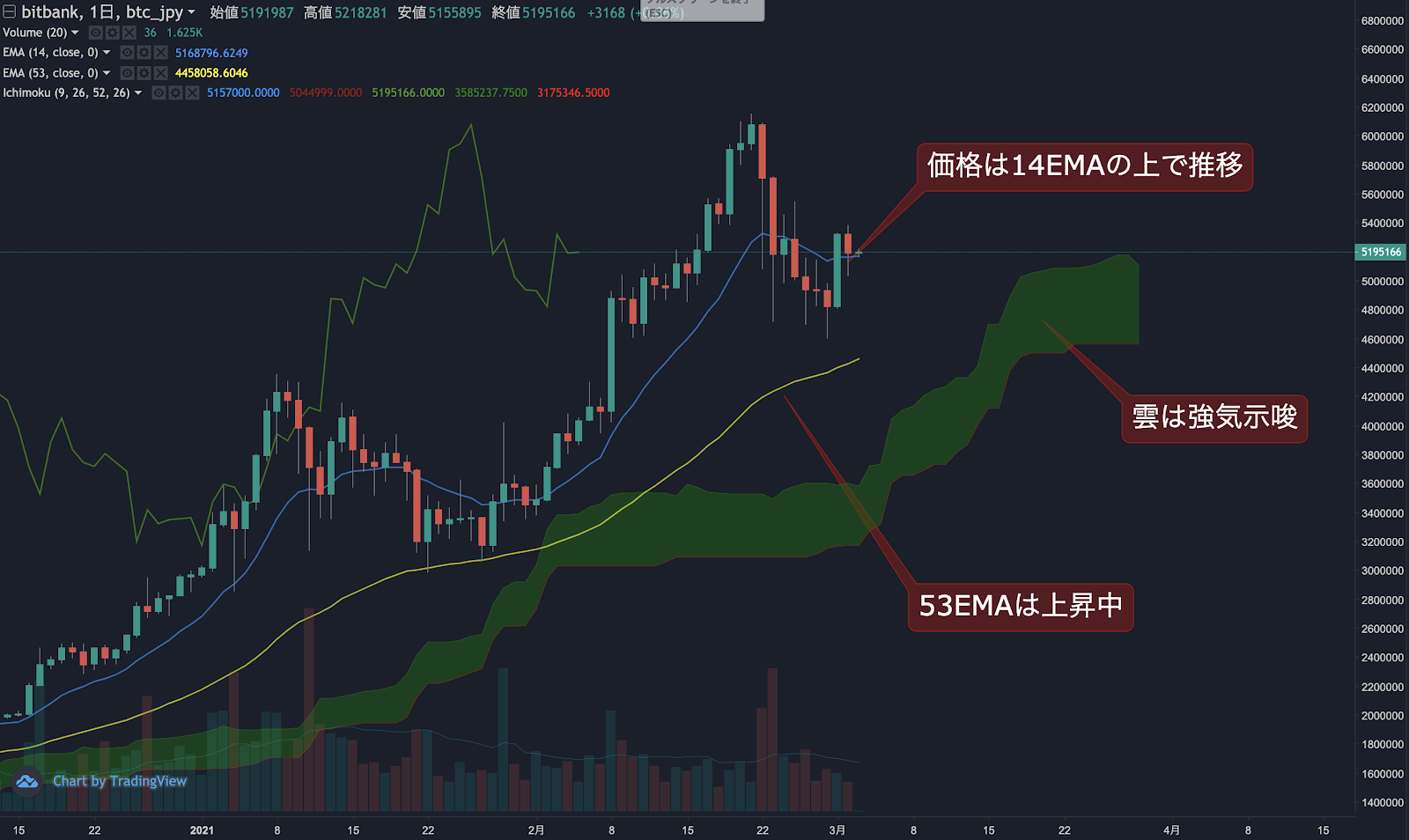 昨日のビットコイン(BTC)の日足終値は、前日から2.3%下落した519.1万円でした。価格は14EMA(516.4万円)を上回り強気示唆です。53EMA(442.9万円)は上昇中で長期トレンドも強気です。一目均衡表の雲は先行スパン1(517.5万円)が先行スパン2(456.9万円)を上回り強気示唆です。