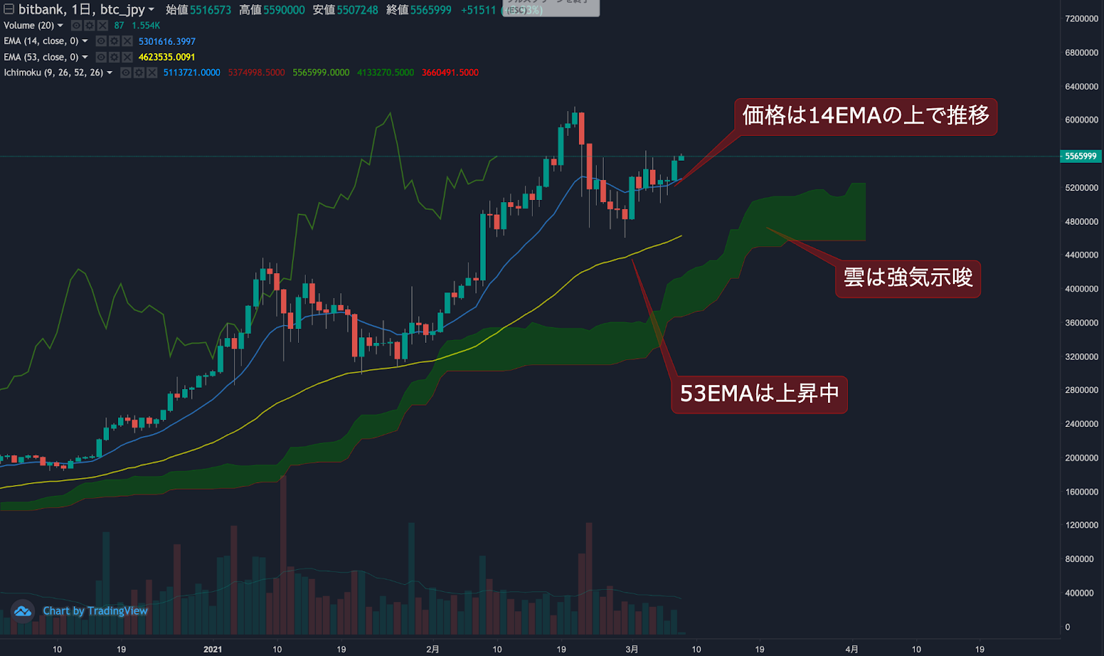 昨日のビットコイン(BTC)の日足終値は、前日から4.3%上昇した551.4万円でした。価格は14EMA(526.0万円)を上回り強気示唆です。53EMA(458.7万円)は上昇中で長期トレンドも強気です。一目均衡表の雲は先行スパン1(524.4万円)が先行スパン2(456.4万円)を上回り強気示唆です。
