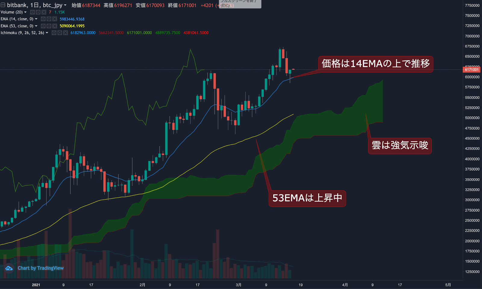 昨日のビットコイン(BTC)の日足終値は、前日から1.9%上昇した620.7万円でした。価格は14EMA(596.0万円)を上回り強気示唆です。53EMA(504.9万円)は上昇中で長期トレンドも強気です。一目均衡表の雲は先行スパン1(585.1万円)が先行スパン2(489.1万円)を上回り強気示唆です。