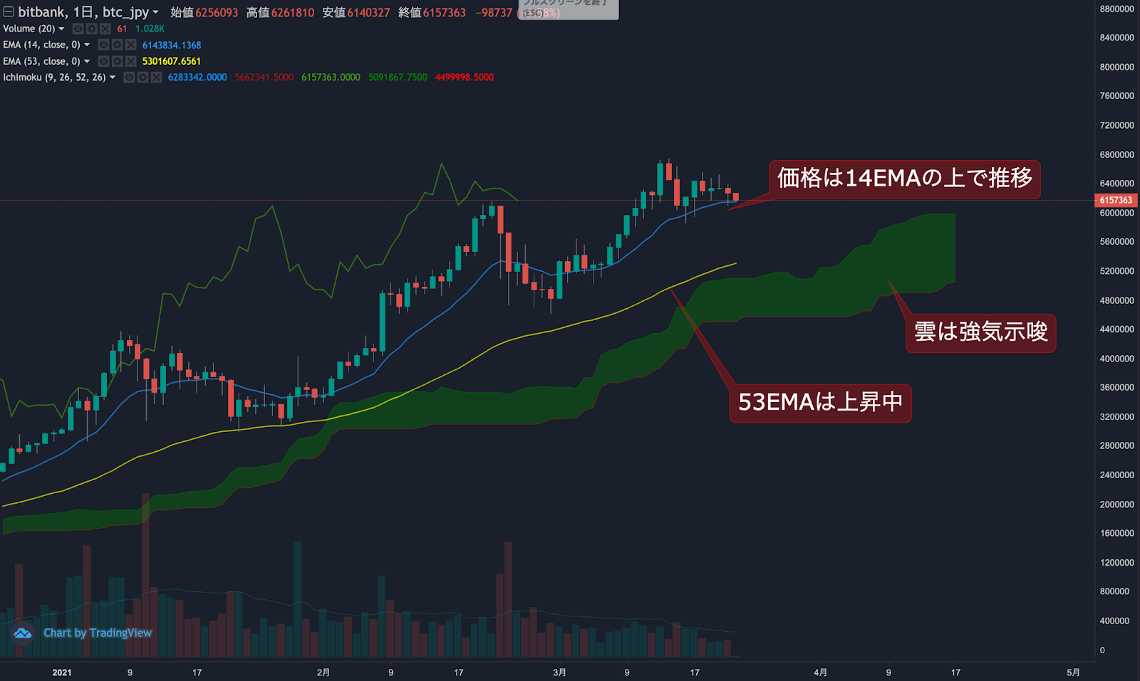 昨日のビットコイン(BTC)の日足終値は、前日から1.1%下落した625.6万円でした。価格は14EMA(614.1万円)を上回り強気示唆です。53EMA(526.8万円)は上昇中で長期トレンドも強気です。一目均衡表の雲は先行スパン1(597.2万円)が先行スパン2(502.9万円)を上回り強気示唆です。