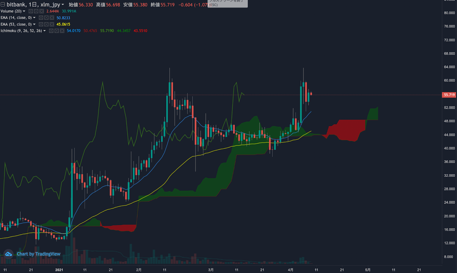 昨日のビットコイン(BTC)の日足終値は、前日から3.0%上昇した635.0万円でした。価格は14EMA(630.6万円)を上回り強気示唆です。53EMA(575.4万円)は上昇中で長期トレンドも強気です。一目均衡表の雲は先行スパン1(634.8万円)が先行スパン2(566.2万円)を上回り強気示唆です。