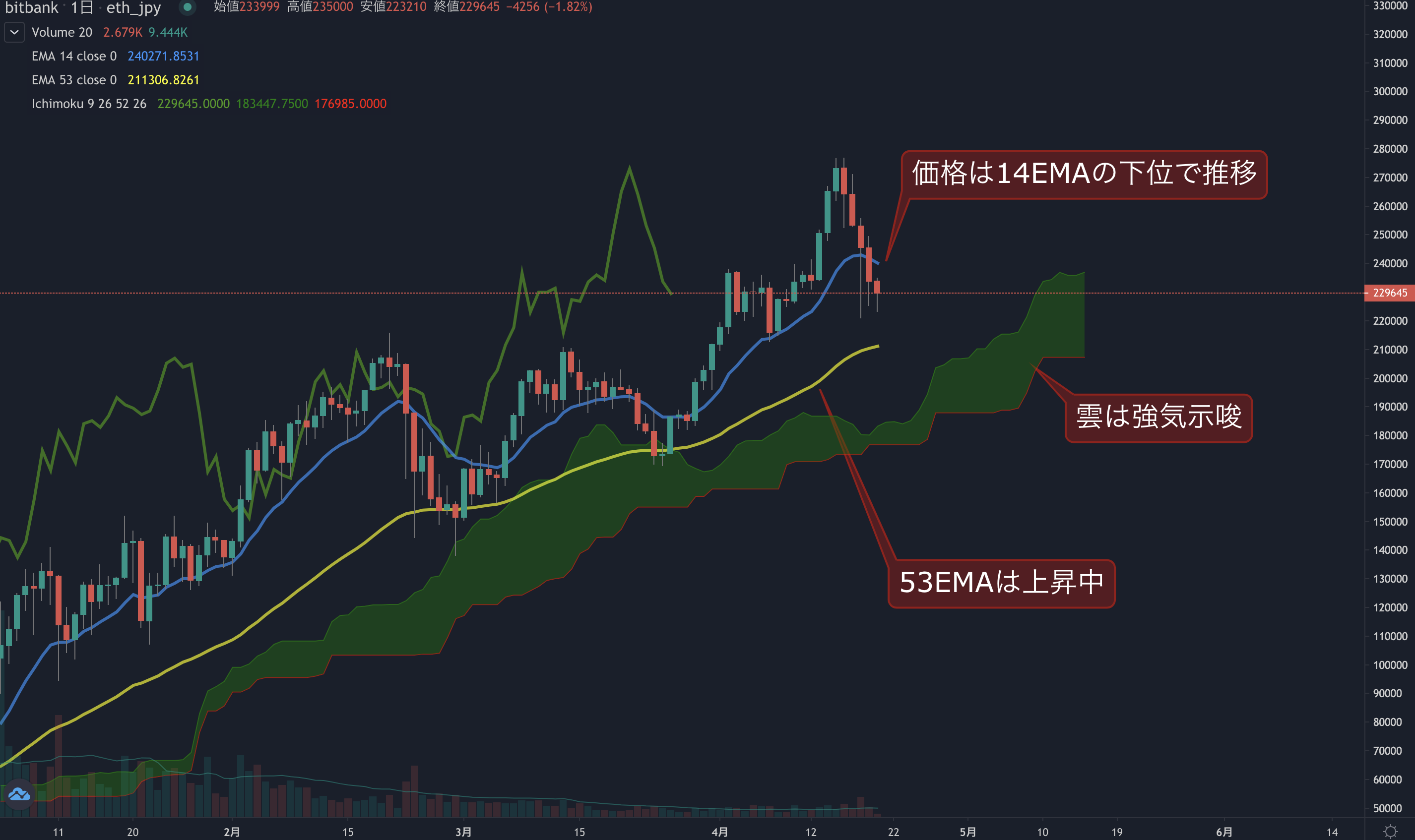 昨日のイーサリアム(ETH)の日足終値は、前日から4.7%下落した23.3万円でした。価格は14EMA(24.1万円)を下回り弱気示唆です。53EMA(21.0万円)は上昇中で長期トレンドは強気です。一目均衡表の雲は先行スパン1(23.6万円)が先行スパン2(20.7万円)を上回り強気示唆です。