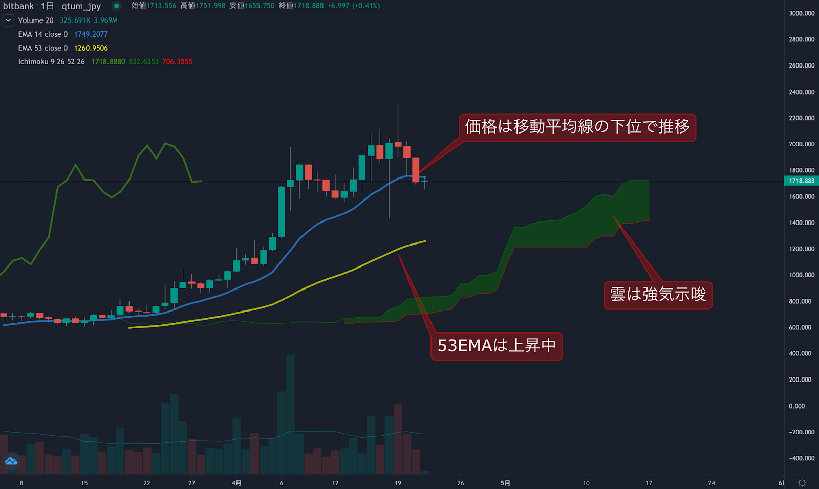 4月21日のビットコインの日足終値は移動平均線を下回り弱気トレンドを示唆し、すべてのオシレーターがマイナス域で推移しておりこれをコンファームしています。