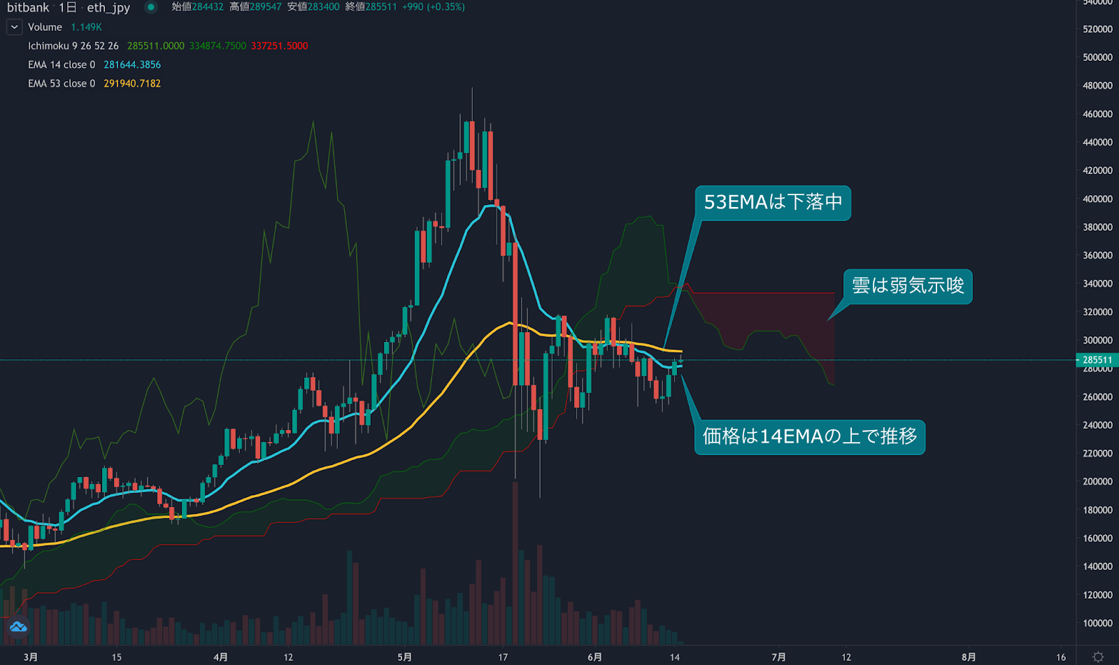 昨日のイーサリアム(ETH)の日足終値は、前日から3.4%上昇した28.4万円でした。価格は14EMA(28.1万円)を上回り強気示唆です。53EMA(29.2万円)は下落中で長期トレンドは弱気です。一目均衡表の雲は先行スパン1(26.9万円)が先行スパン2(33.3万円)を下回り弱気示唆です。