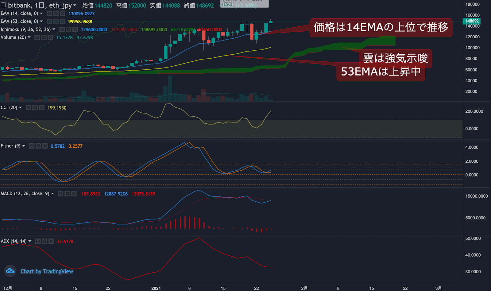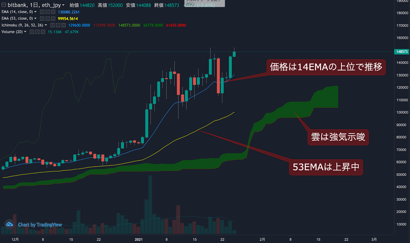昨日のイーサリアム(ETH)の日足終値は、前日から13.2%上昇した14.4万円でした。価格は14EMA(12.7万円)を上回り強気示唆です。53EMA(9.8万円)は上昇中で長期トレンドも強気です。一目均衡表の雲は先行スパン1(12.1万円)が先行スパン2(10.3万円)を上回り強気示唆です。