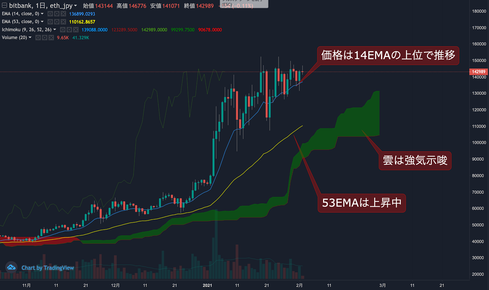 昨日のビットコイン(BTC)の日足終値は、前日から4.0%上昇した14.3万円でした。価格は14EMA(13.5万円)を上回り強気示唆です。53EMA(10.8万円)は上昇中で長期トレンドも強気です。一目均衡表の雲は先行スパン1(13.1万円)が先行スパン2(10.4万円)を上回り強気示唆です。