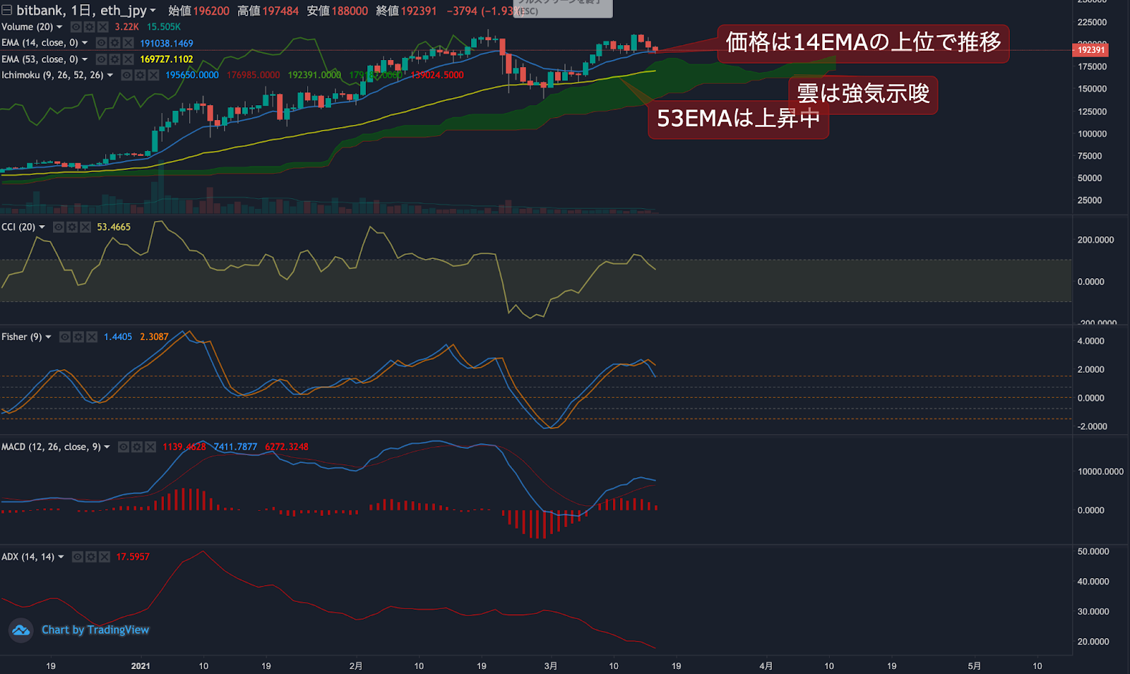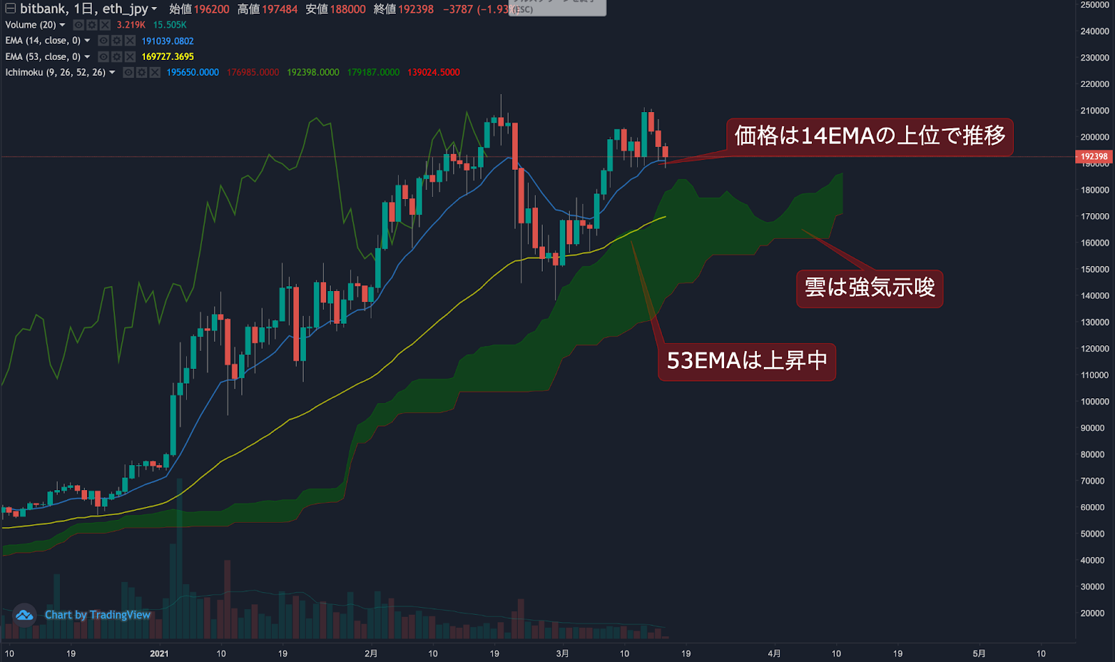 昨日の イーサリアム(ETH)の日足終値は、前日から2.9%下落した19.6万円でした。価格は14EMA(19.0万円)を上回り強気示唆です。53EMA(16.8万円)は上昇中で長期トレンドも強気です。一目均衡表の雲は先行スパン1(18.5万円)が先行スパン2(16.9万円)を上回り強気示唆です。