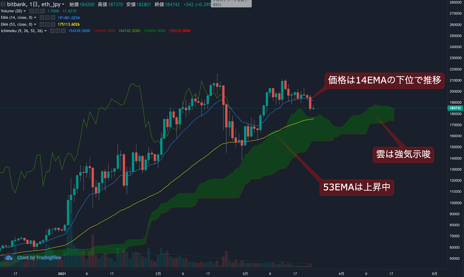 昨日のイーサリアム(ETH)の日足終値は、前日から5.3%下落した18.4万円でした。価格は14EMA(19.2万円)を下回り弱気示唆です。53EMA(17.4万円)は上昇中で長期トレンドは強気です。一目均衡表の雲は先行スパン1(18.5万円)が先行スパン2(17.3万円)を上回り強気示唆です。