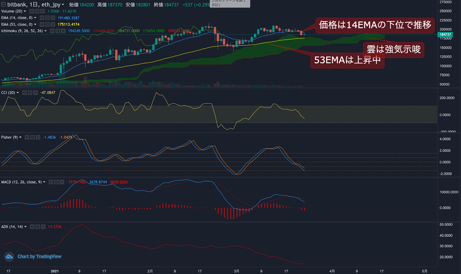 3月22日のイーサリアムの日足終値は移動平均線を下回り弱気トレンドを示唆し、オシレーターのCCIとFisherがマイナス域で推移しておりこれをコンファームしています。