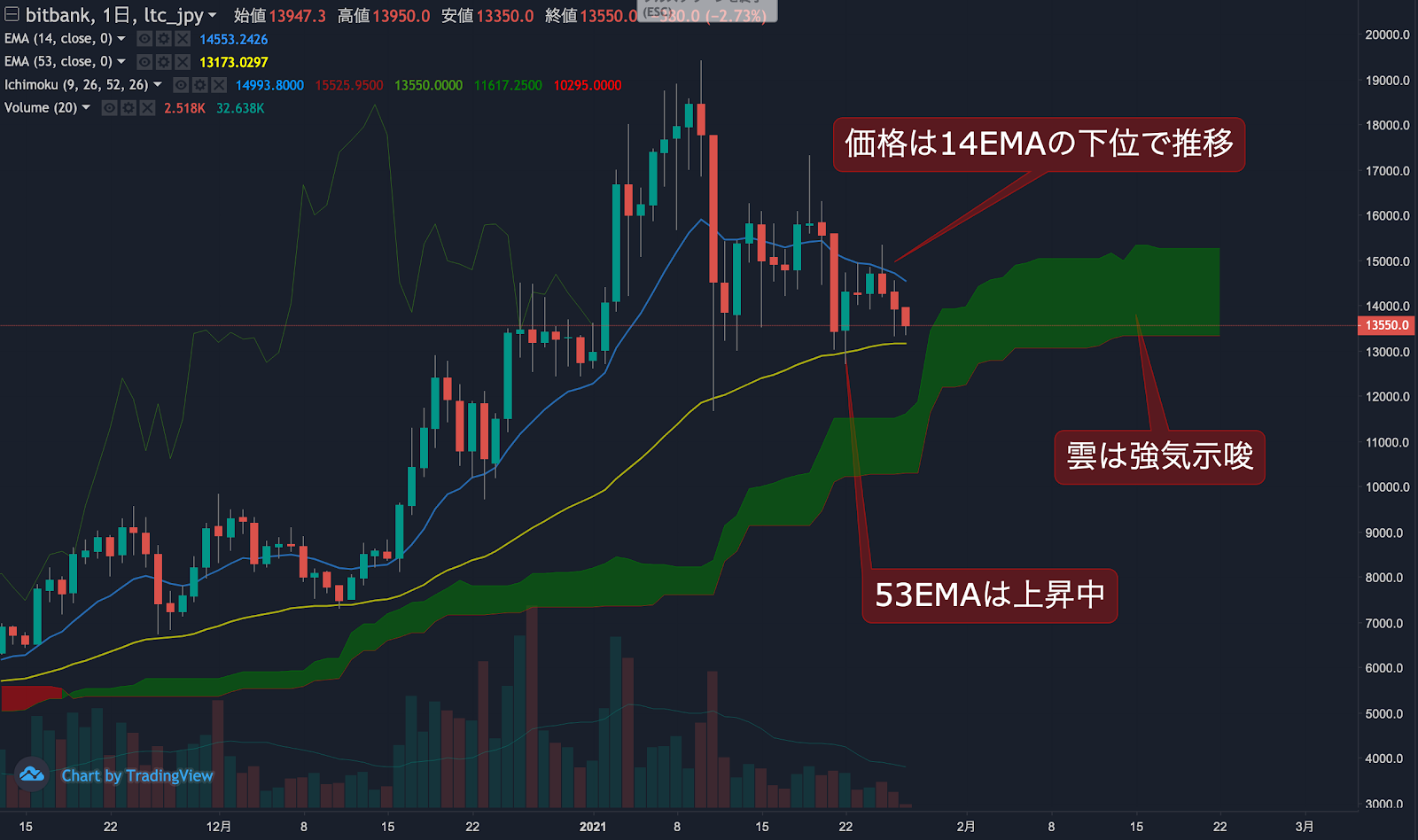 昨日のライトコイン(LTC)の日足終値は、前日から2.4%下落した1.39万円でした。価格は14EMA(1.47万円)を下回り弱気示唆です。53EMA(1.31万円)は上昇中で長期トレンドは強気です。一目均衡表の雲は先行スパン1(1.52万円)が先行スパン2(1.33万円)を上回り強気示唆です。