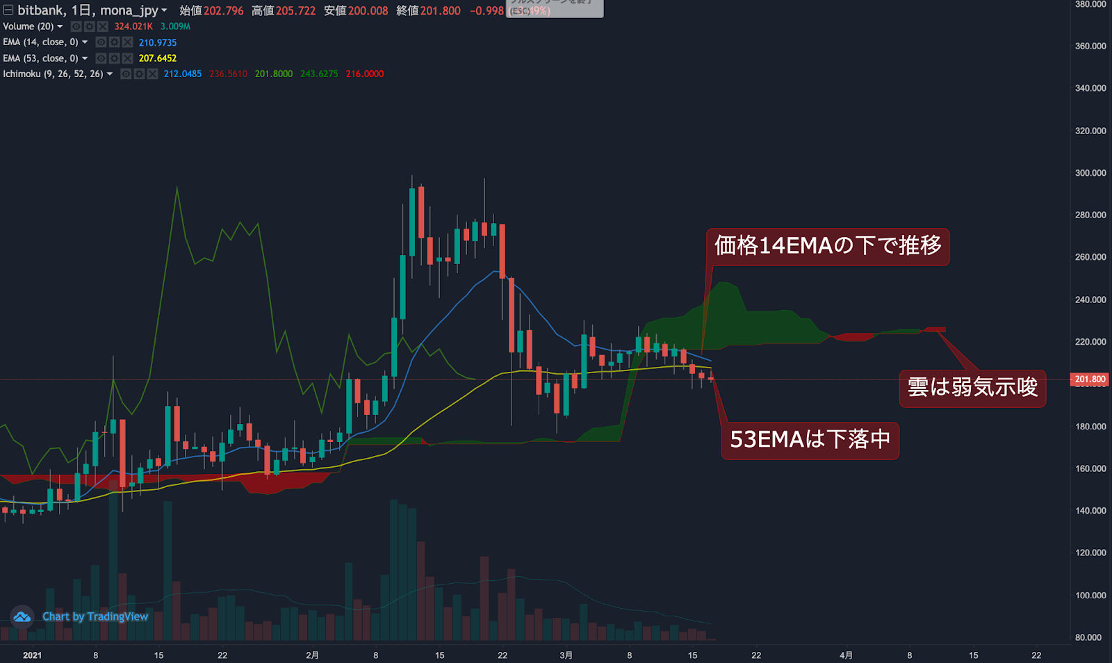 昨日のモナコイン(MONA)の日足終値は、前日から1.0%下落した202.7円でした。価格は14EMA(212.3円)を下回り弱気示唆です。53EMA(207.8円)は下落中で長期トレンドも弱気です。一目均衡表の雲は先行スパン1(224.3円)が先行スパン2(226.5円)を下回り弱気示唆です。