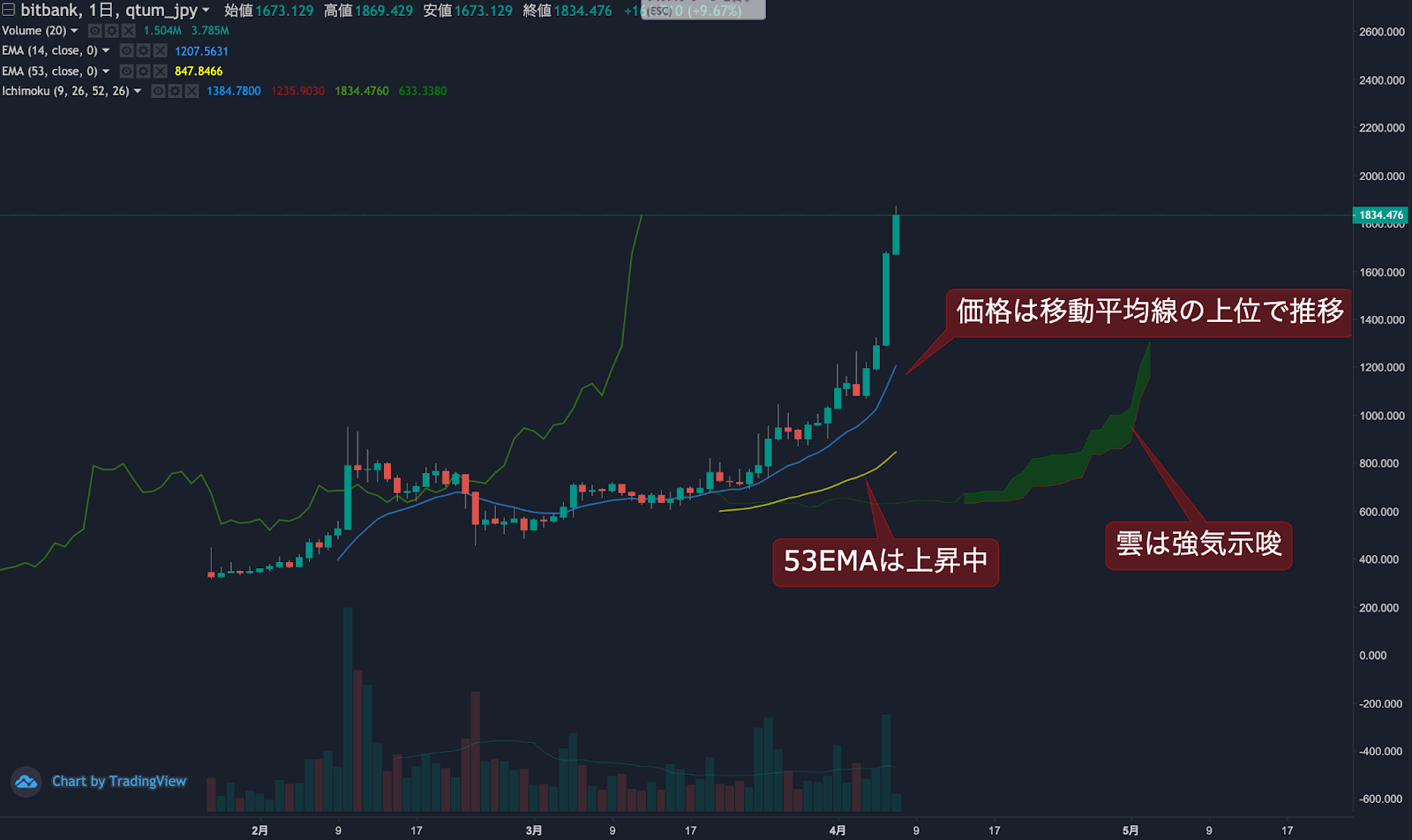 昨日のクアンタム(QTUM)の日足終値は、前日から29.6%上昇した1672円でした。価格は14EMA(1111円)を上回り強気示唆です。53EMA(809円)は上昇中で長期トレンドも強気です。一目均衡表の雲は先行スパン1(1208円)が先行スパン2(1067円)を上回り強気示唆です。