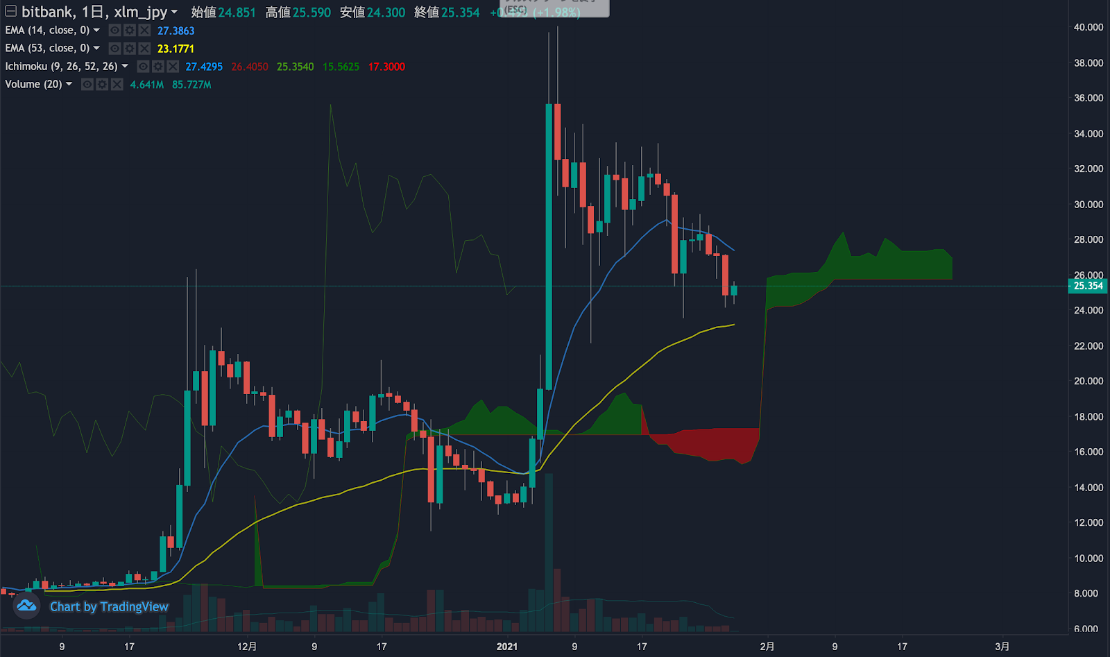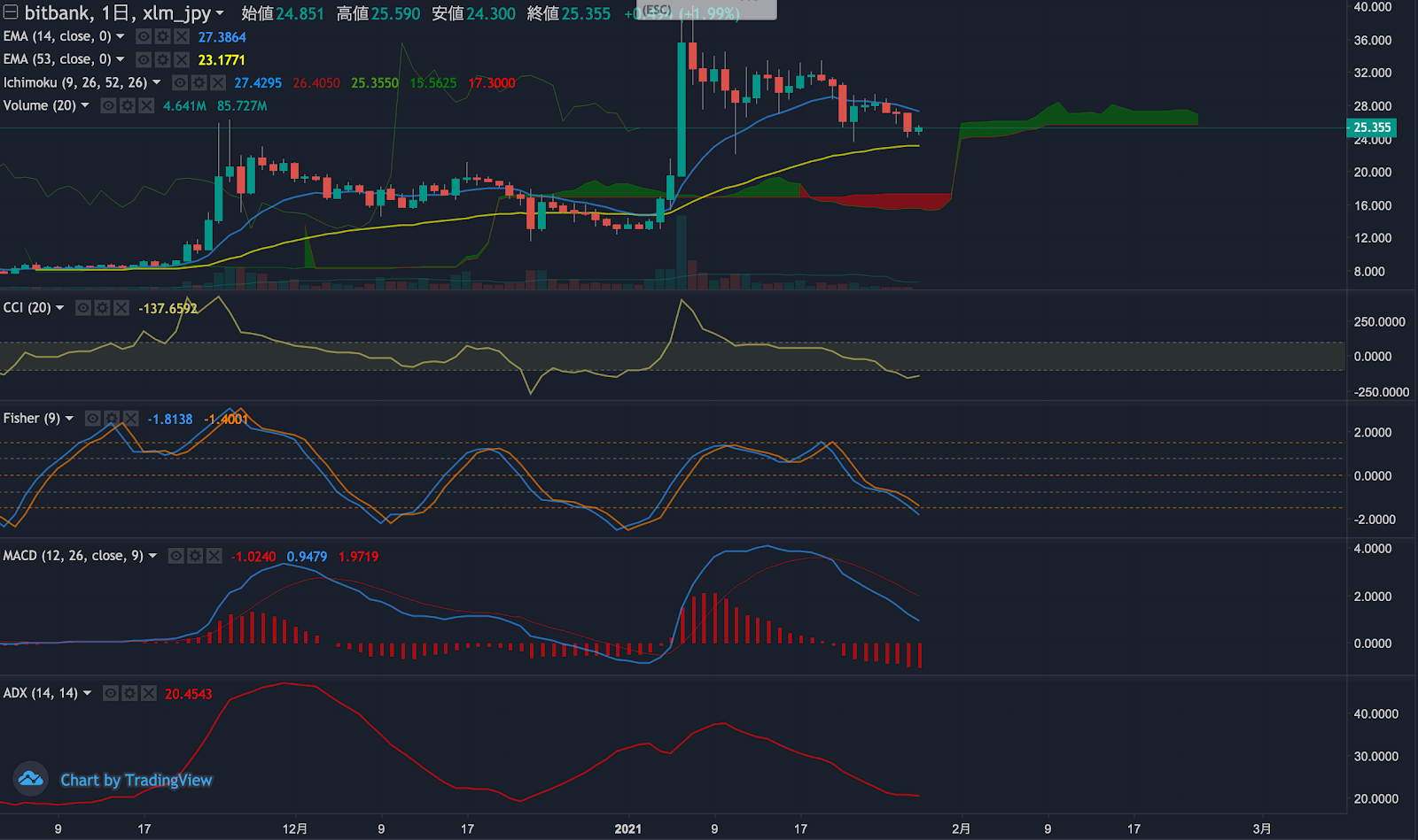 昨日のステラ(XLM)の日足終値は、前日から8.2%下落した24.8円でした。価格は14EMA(27.6円)を下回り弱気示唆です。53EMA(23.0円)は上昇中で長期トレンドは強気です。一目均衡表の雲は先行スパン1(27.4円)が先行スパン2(25.7円)を上回り強気示唆です。