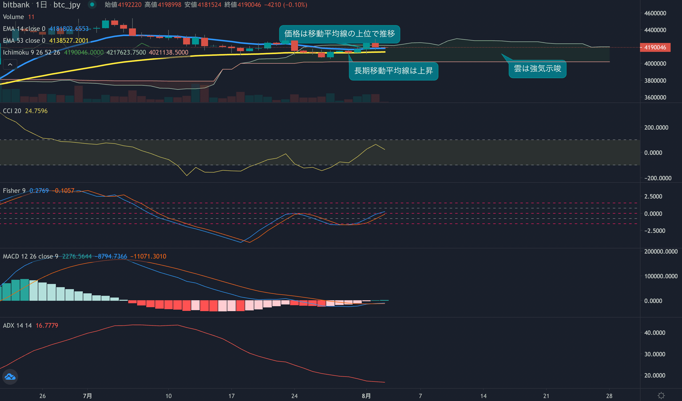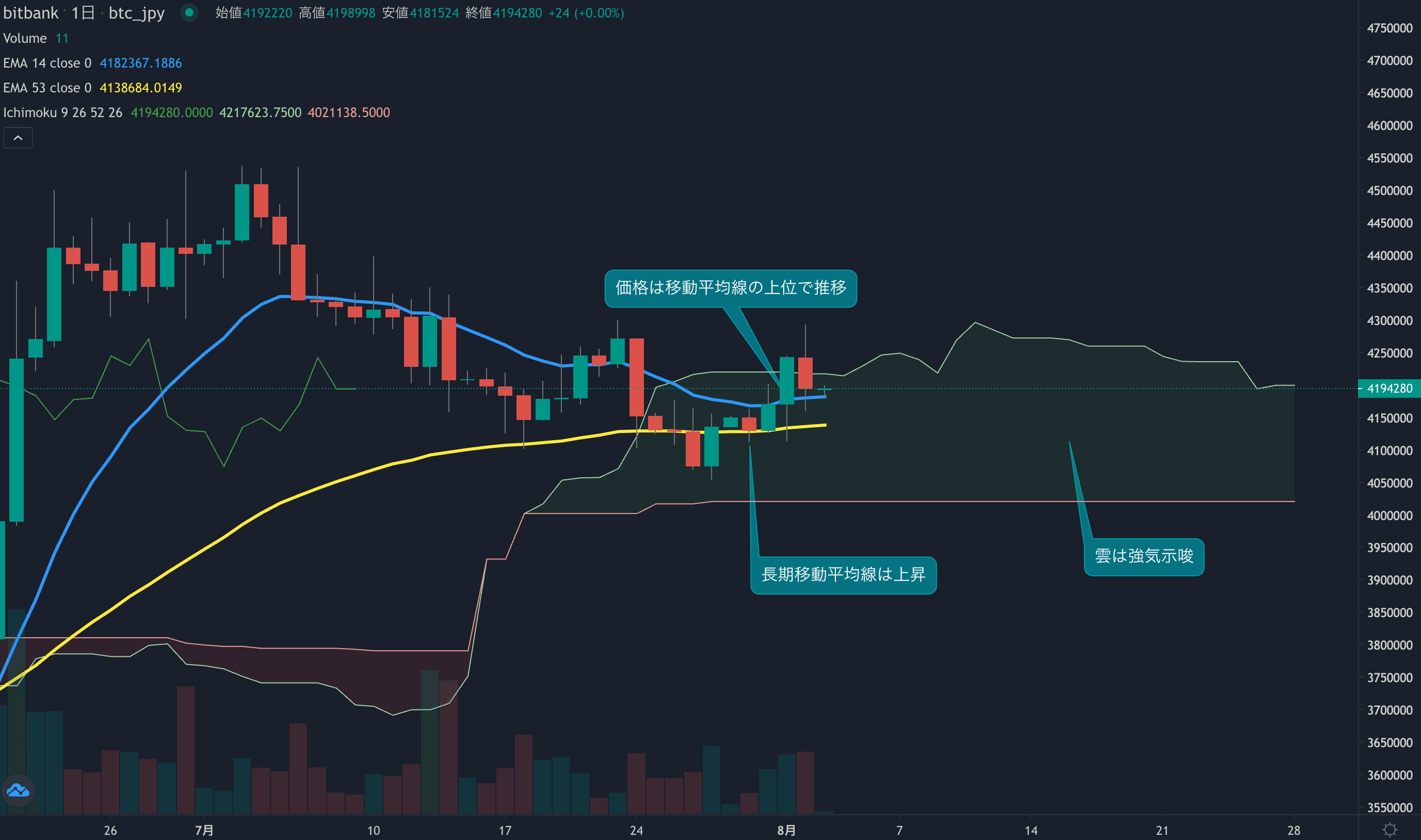 価格は14EMA(418.0万円)を上回り強気示唆です。53EMA(413.6万円)は上昇しており長期トレンドも強気です。一目均衡表の雲は先行スパン1(419.9万円)が先行スパン2(402.1万円)を上回り強気示唆です。