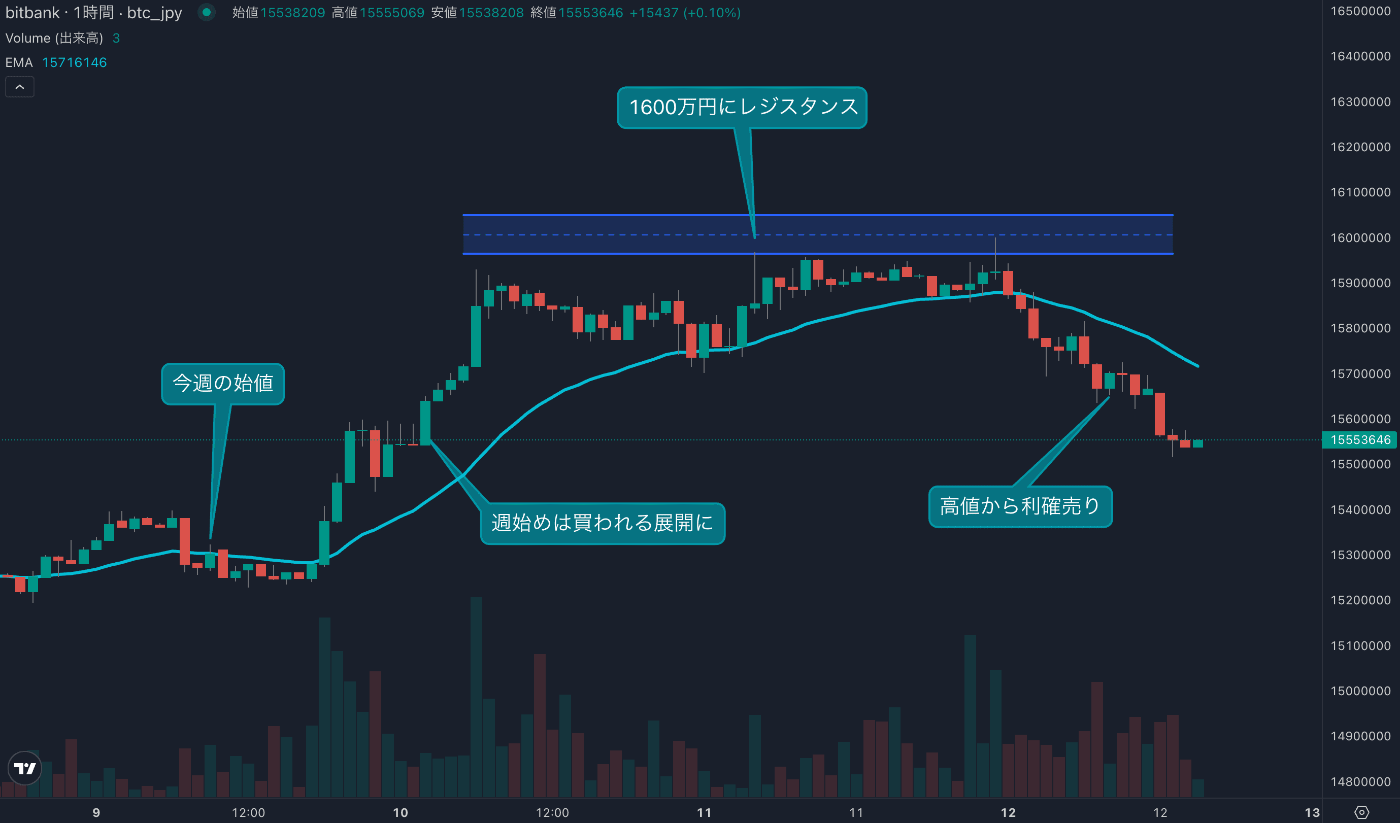 1600万円到達もモメンタムは上がらず、足元では売りが強い状況か