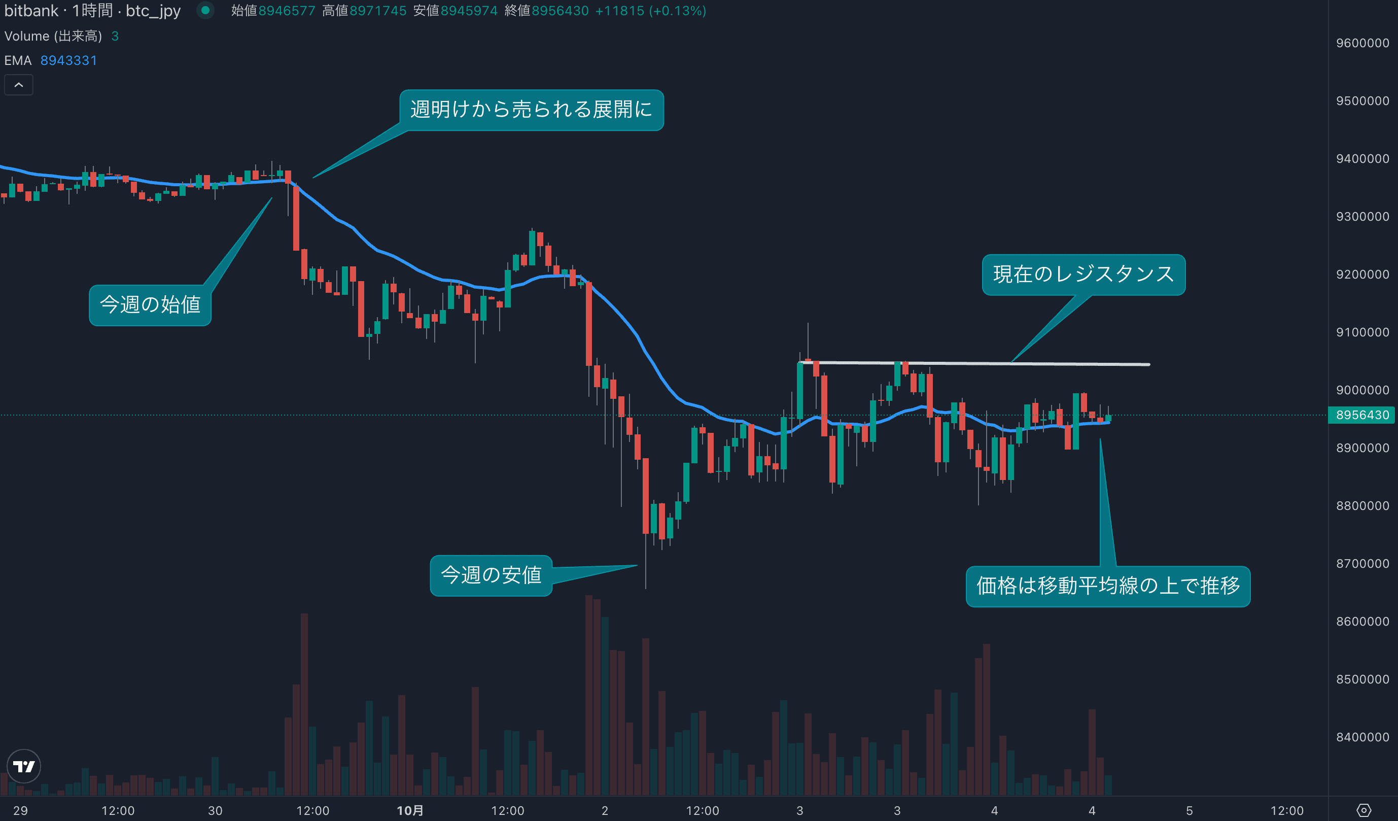 - 今週のビットコインは10月30日の937万円から取引が始まりました。今週の相場は、週明けから売られる展開となり、先週までの底堅い流れが逆転しました。月曜日と火曜日で6%ほど売られ、安値は865万円まで下げました。安値をつけた後は買い戻しが入り、横ばいの展開となります。足元では900万円近辺がレジスタンスとなっており、今後この価格帯を超えていけるか注目です。現在、価格は24時間移動平均線を上回って推移していますが、今週の安値を更新するような動きがあれば、これまで上昇トレンドが反転している可能性が高まります。