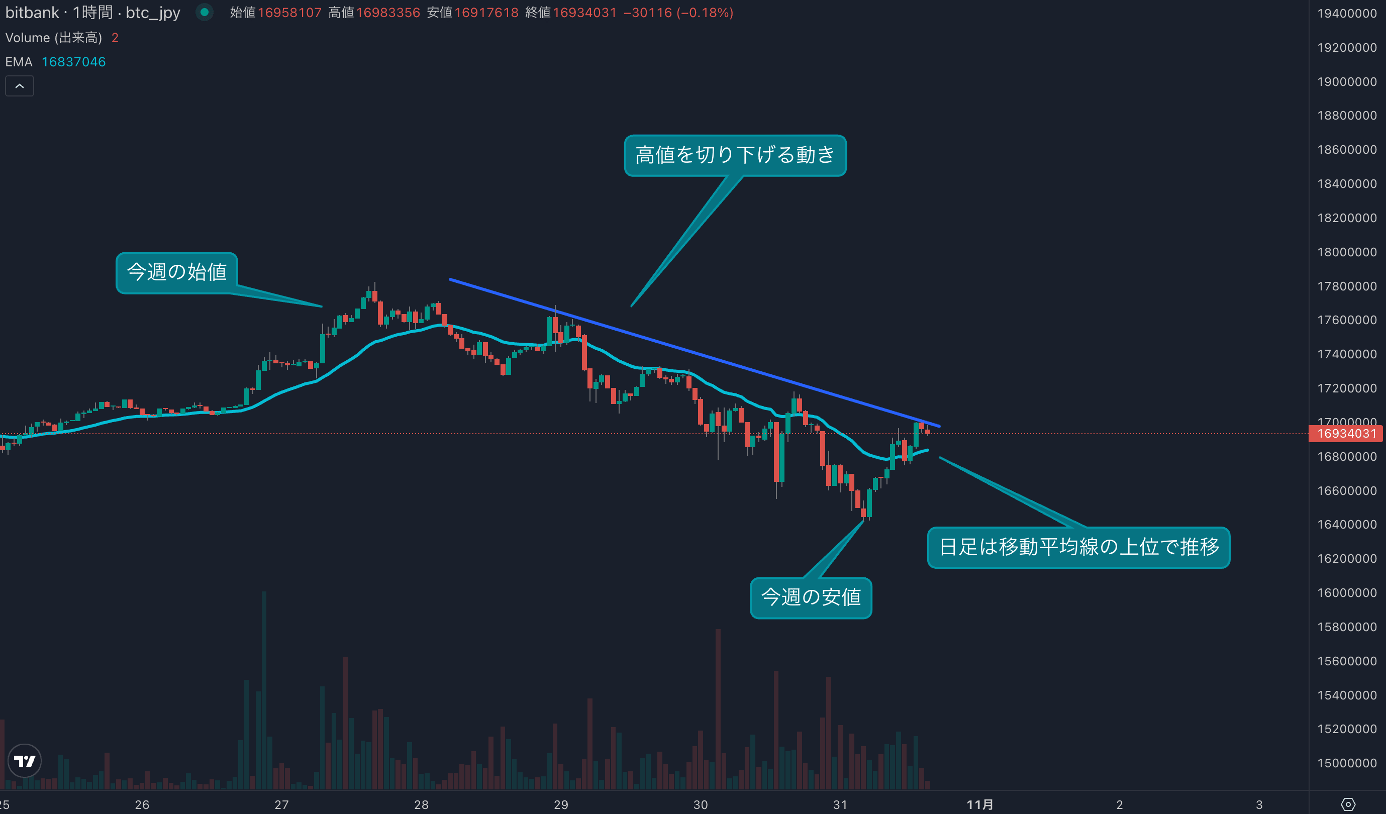 - 今週のビットコインは10月27日の1751万円から取引が始まりました。先週末は相場が上昇し、今週は買いが継続すると思われましたが、週始めから上値が重くなりました。週中に入っても高値を切り下げる動きは止まらず、日足では連続陰線となりました。安値は1641万円となり、先週の上昇分を帳消しにする動きとなりました。金曜日に入り買い戻しが入り、現在は24時間移動平均線(24EMA)を上回り、下落のトレンドラインを試す展開が見られます。トレンドラインを超えることができれば、来週の反発の目が出てくるでしょう。トレンドラインを明確に超えるまでは下落方向への動きに警戒です。