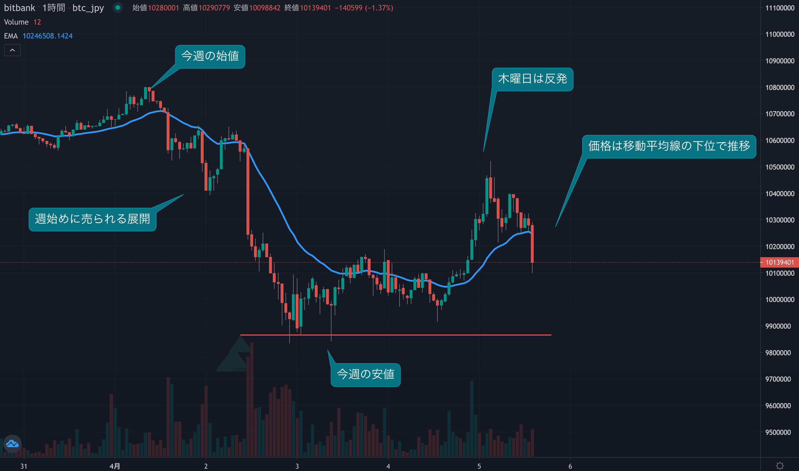 - 今週のビットコインは4月1日の1079万円から取引が始まりました。足元の高値から取引がスタートしたビットコインですが、今週は売りが目立つ展開となりました。週始めから下落が目立ち、価格は火曜日に980万円台まで下落しました。週央に入ると買い戻しが入り、木曜日には一時大きく反発しました。一方、本日は再度弱い展開となり、現在は価格が24時間移動平均線(24EMA)を下回っています。足元の価格は1014万円となっています。週次の下落は約6%となり、久々に大きな週足の陰線となる可能性があります。