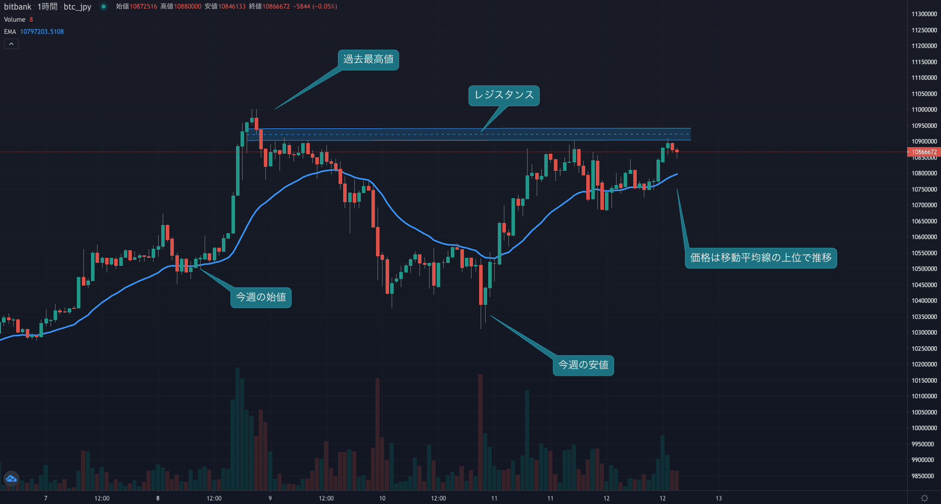 - 今週のビットコインは4月8日の1052.9万円から取引が始まりました。今週の相場は週始めから買われる展開となり、価格は過去最高値を更新し、一時1100万円を記録しました。一方、高値を維持することはできず火曜日には月曜日の上昇分をかき消す展開となりました。相場は週央に入ると再度底堅さを取り戻し、上値を試す動きになりました。現在は1090万円台がレジスタンスとなり上値の重しとなっています。1時間足は移動平均線を上回り、週後半は買いの流れとなっています。短期では高値を更新しようとする動きが見られます。