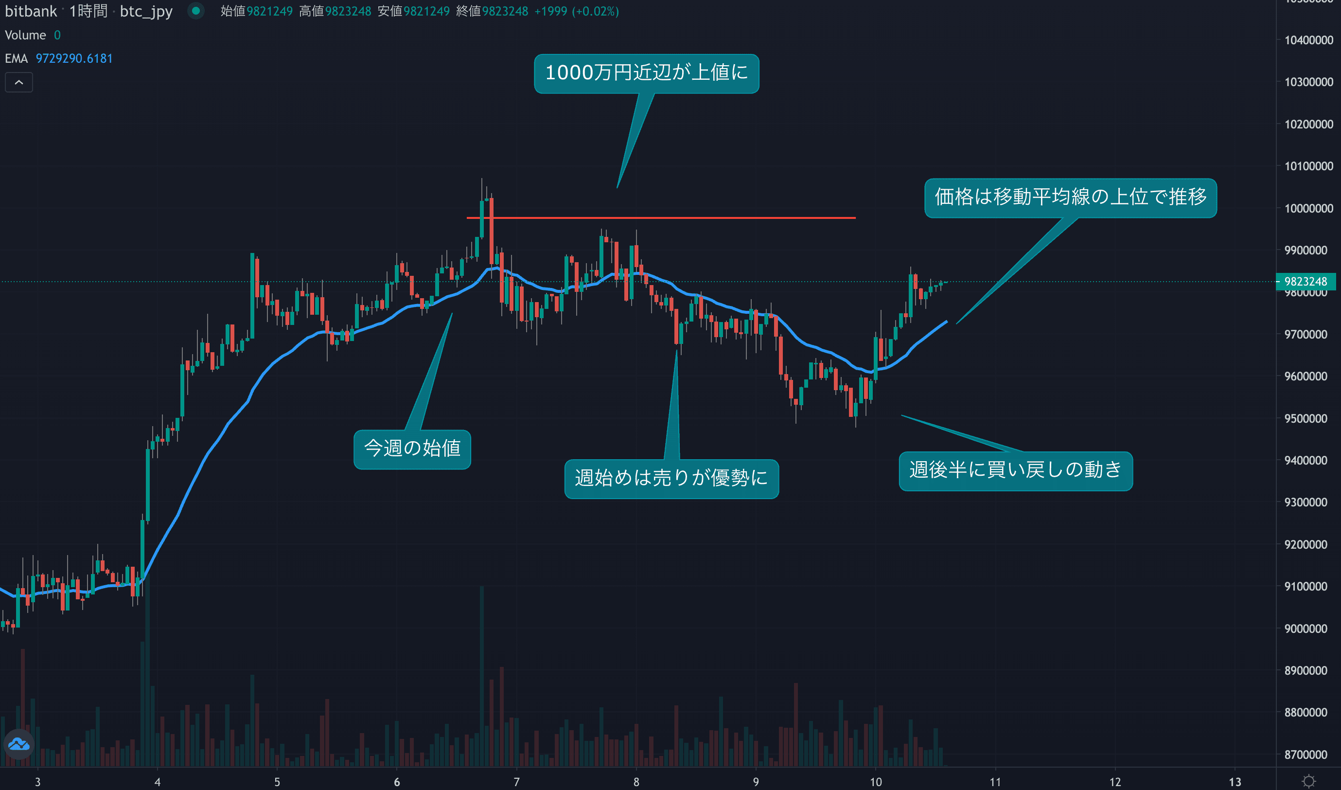 - 今週のビットコインは5月6日の984万円から取引が始まりました。先週後半は日本ではGWでしたが、相場が上昇し、買いが強い状況で週明けとなりました。月曜日は週末の強い流れが継続し、一時1000万円を突破する動きがありました。一方、1000万円近辺からは上値が重くなり、戻りが発生してしまいました。週中は上値が重い展開となり、徐々に安値を切り下げる動きとなりました。月曜日から3日連続でマイナスとなる相場展開でしたが、木曜日には950万円近辺から買い戻しが入り、反発しました。足元では1時間足が24時間移動平均線(24EMA)を上回っています。足元では再度上昇する流れとなっていますが、1000万円を超えられるか否かが来週以降の相場にも大きな影響を及ぼすでしょう。