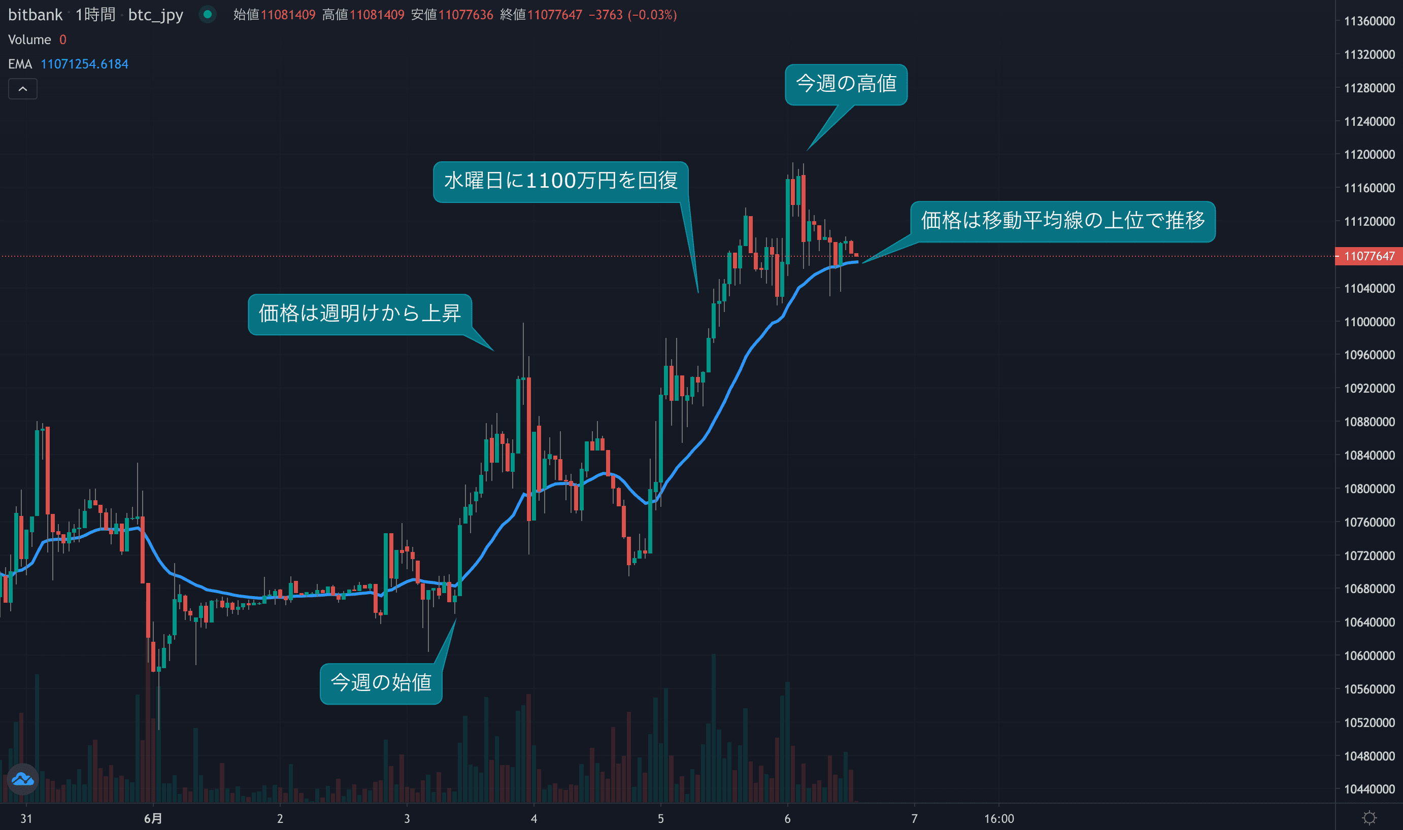 - 今週のビットコインは6月3日の1066万円から取引が始まりました。月曜日から相場は買われて取引が開始され、価格は1100万円手前まで上昇しました。今週は多少の下げは買い戻される動きとなり、かなり底堅い動きが見られました。水曜日には過去最高値を試す展開も見られ、上値を追う相場が継続しています。ビットコイン円の1時間足は現在も24時間移動平均線を上回っており、今後も高値を試す展開が期待されます。価格は1100万円台を維持しており、週後半も底堅い動きが予想されます。