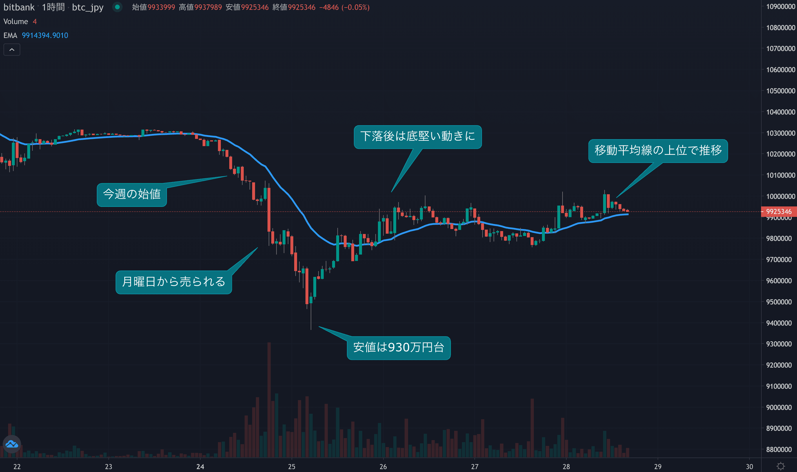 - 今週のビットコインは6月24日の1012万円から取引が始まりました。相場は月曜日から売られる展開となり、先週からの下落の流れを引き継ぎました。価格は一時930万円台まで下落し、ここ8週間の安値を更新しました。一方、下落後は底堅い推移となり、1000万円手前で横ばい推移しています。1時間足は足元で24時間移動平均線の上位で推移しています。下落後に即座に反発したビットコインですが、1000万円を超えることに苦労しています。このまま1000万円を超えられずに来週を迎えることになると、再度安値を目指すことが予想されます。