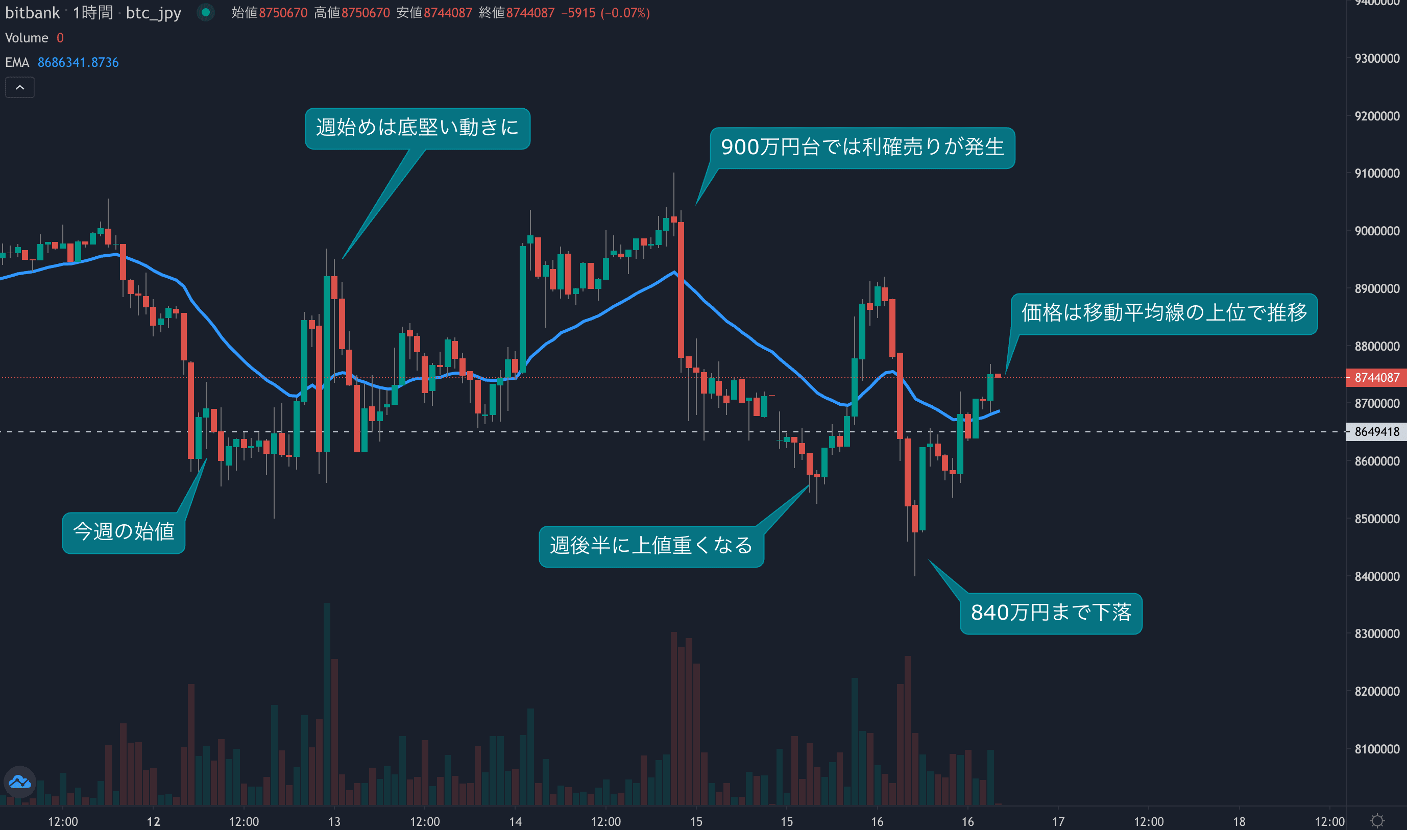 - 今週のビットコインは8月12日の865万円から取引が始まりました。週始めは底堅い動きとなり、買いが先行しました。今週は先週に続き900万円を回復する場面がありましたが、高値では利確売りに押され、上値が重くなる展開となりました。木曜日には一時840万円を記録し、今週の安値を更新しました。週後半に弱い値動きが目立つ動きとなりましたが、本日は再度買い戻され、価格は24時間移動平均線(24EMA)を上回っています。現在のところ小幅なプラスとなっていますが、今週は850万円から900万円のレンジでの推移となりました。相場全体としては高値の900万円を超えることに苦労しており、引き続き弱いチャートとなっています。