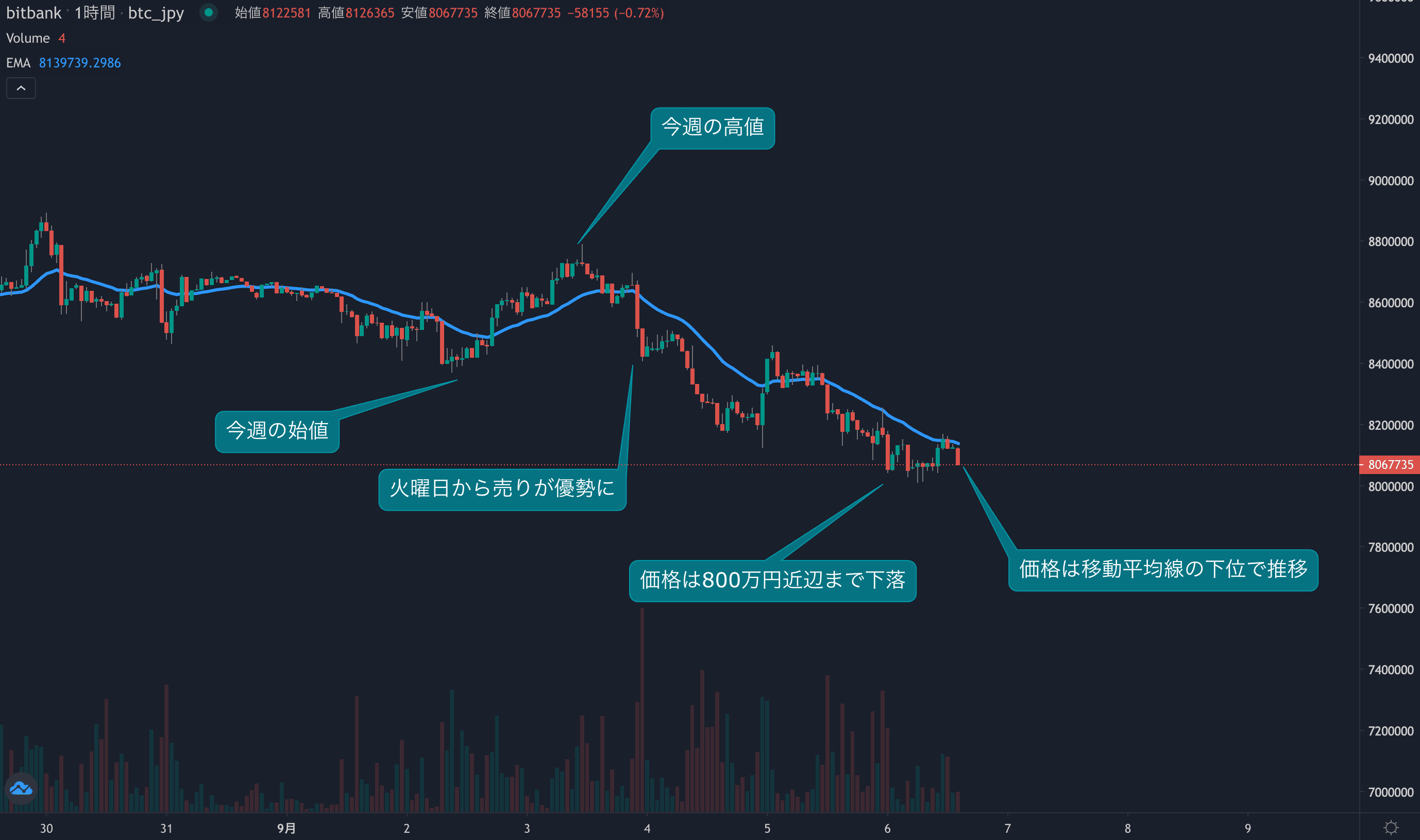 - 今週のビットコインは9月2日の840万円から取引が始まりました。週始めの月曜日には879万円まで上昇する場面がありましたが、火曜日からは売り一辺倒の相場となりました。価格は木曜日は800万円近辺まで下落しましたが、小幅に反発し800万円割れとはなりませんでした。一方、本日も価格が24時間移動平均線(24EMA)を下回っており、安値を更新する可能性が高まっています。今週は火曜日以降から売りが強い状況が、週末まで続いています。現在のところ強い反発もなく、来週以降の相場も不安が残るチャートとなっています。