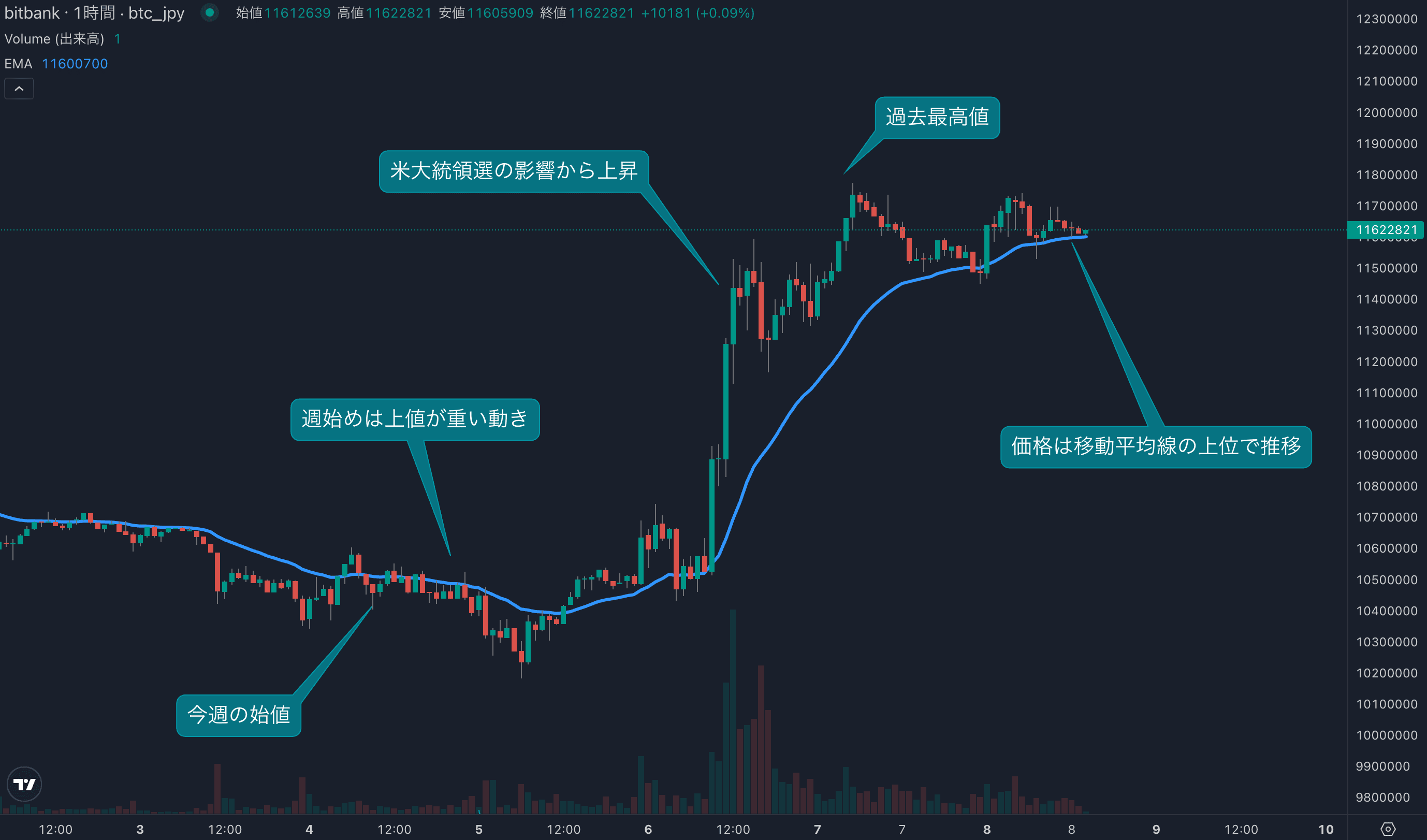 - 今週のビットコインは11月4日の1018万円から取引が始まりました。週始めは、先週からの上値の重い流れが継続し下落しました。一方、火曜日になると買い戻しが入るようになり、水曜日に大統領選の結果が市場に伝わると相場は一気に上昇しました。大統領選前の買い控えの反動から、金融市場全体が買われ、ビットコインは高値を追う動きに発展しました。木曜日には1177万円を記録し、1200万円タッチが見えてきました。価格は現在1160万円台で推移し24時間移動平均線(24EMA)を超え、底堅い動きが継続しています。来週以降も上値を伺う展開を期待させるチャートとなっています。