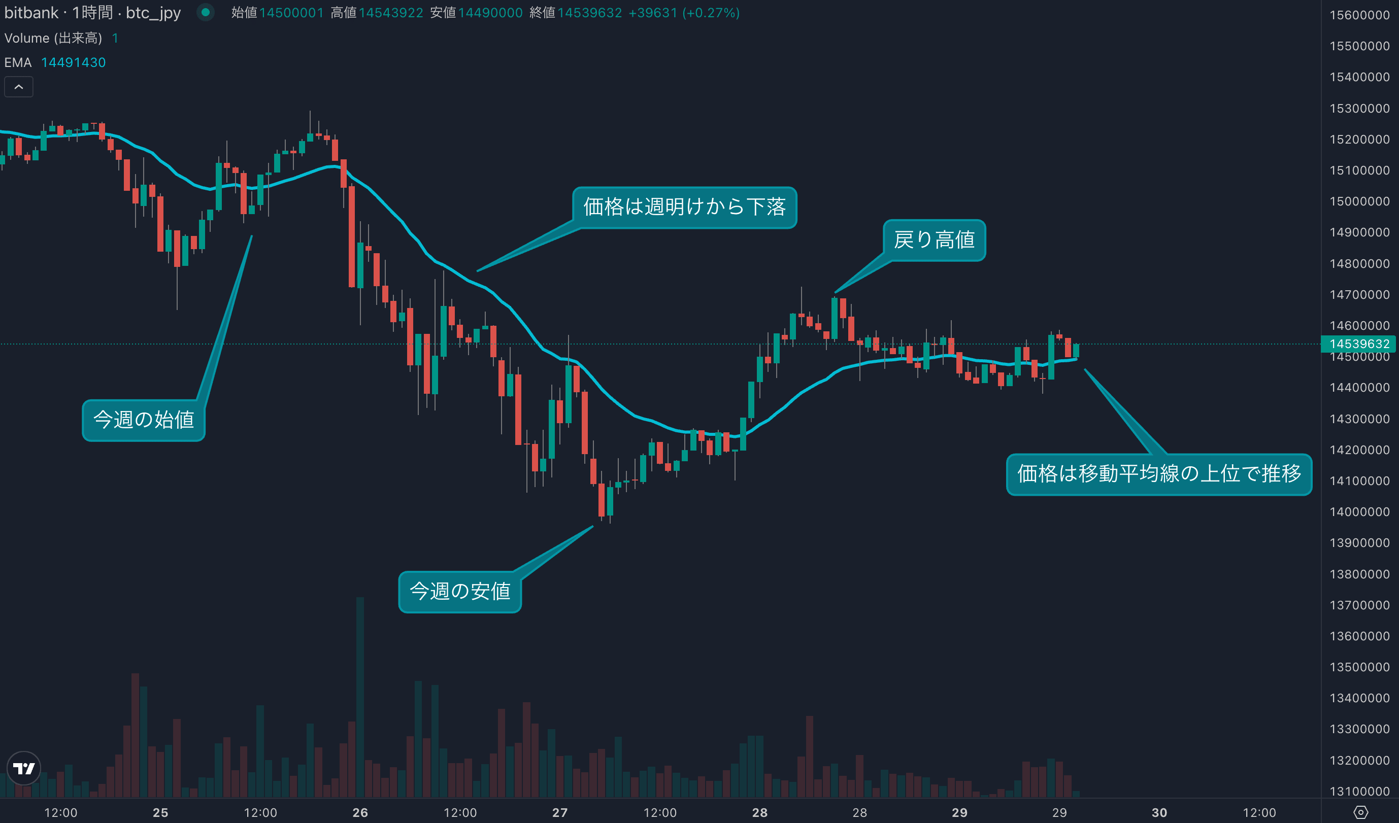 - 今週のビットコインは11月25日の1453万円から取引が始まりました。今週は週始めから売られる展開となり、上値が重い相場となりました。火曜日には1390万円台まで下落し、一時1400万円を割り込みました。一方、1400万円から買い戻しが入り、反発する動きとなりました。戻り高値は1472万円となり、この価格を週末に超えることができるか注目です。現在の価格は24時間移動平均線(24EMA)を上回り強気の値動きとなっています。今週は週始めに下落する動きとなりましたが、後半に入り底堅さを取り戻す相場となりました。