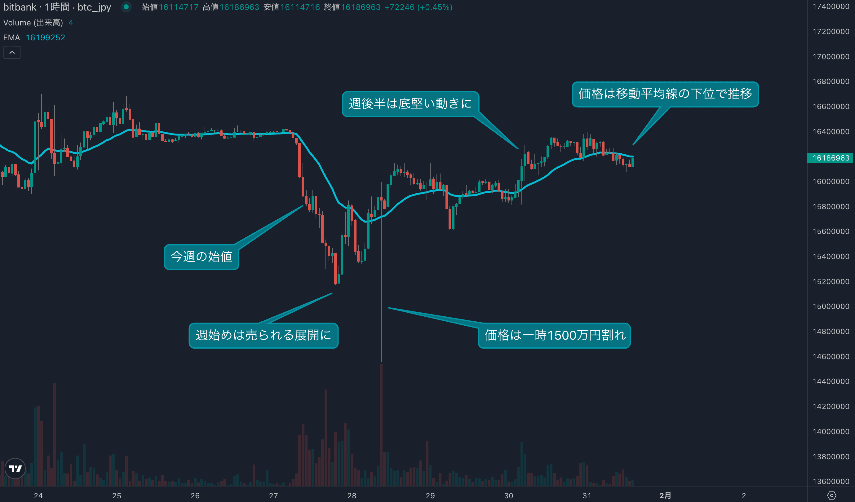 - 今週のビットコインは1月27日の1603万円から取引が始まりました。今週は週始めから売られる展開となりました。27日は1520万円近辺で下げ止まりましたが、28日にビットバンクでは一時1500万円を割り込みました。価格は即座に反発しており、安値圏で指値を置いておけば大きな利益が出ていました。相場は週後半に入り底堅さを取り戻し、1600万円台を回復しています。足元では24時間移動平均線(24EMA)を下回っていますが、週次ではプラスを維持しています。週足では長い下ひげを付けており、現在の価格帯で今週の取引を終えられれば、強気のローソク足となります。引き続き押し目があれば買われる相場となっています。