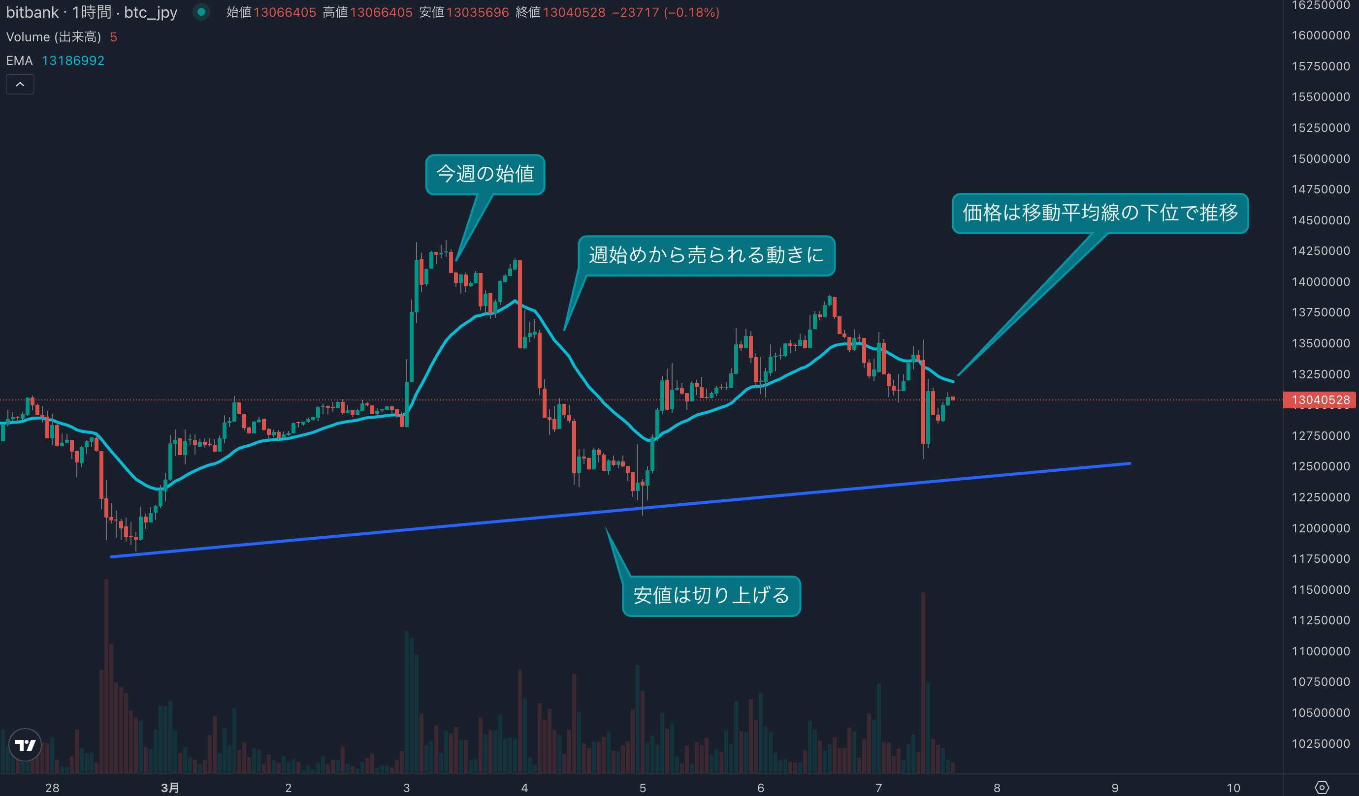 - 今週のビットコインは3月3日の1424万円から取引が始まりました。今週は、週明け直前に相場が反発したため高値からのスタートとなりました。一方、週明け直後に売りが殺到し、月曜日は9.2%の下落を記録しました。火曜日も下落の勢いは止まらず、一時1210万円まで下落する動きがありました。一方、1200万円近辺から買い戻しが入り、水曜日は反発しました。1389万円まで戻した後は再度上値が重くなり、安値を試す展開となりました。上値は重い一方、安値を切り上げていることは、相場が徐々に底堅く推移し始めていることを示唆しています。足元では価格は1306万円で推移し24時間移動平均線(24EMA)を下回っています。来週に向けては、現在の安値のトレンドラインを割らずに維持できるか注目です。