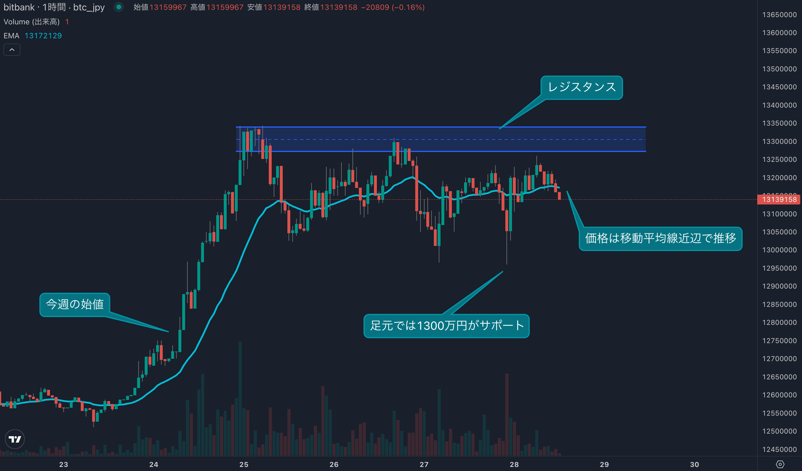 - 今週のビットコインは3月24日の1287万円から取引が始まりました。今週も先週までの流れを引き継ぎ、小幅ながら上昇しています。現在のところ2%ほど上昇しています。上昇は1330万円近辺で上値を抑えられていますが、高値圏で揉み合う動きとなっています。足元では1300万円近辺がサポートとなっており、1300万円から1330万円をどちらに抜けるか注目の価格帯となっています。現在の価格は移動平均線近辺で推移し、方向感がやや欠ける動きとなっています。週末にかけて1330万円を超えることができると、来週も底堅い動きが期待されます。