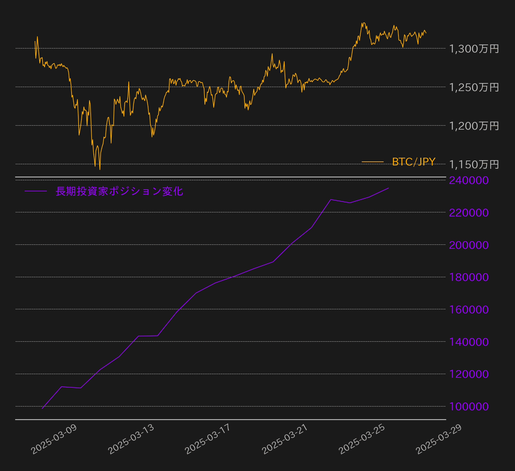 - 今週は価格が1300万円を回復しましたが、ショートポジションの清算は限定的となっています。現在は現物の購入が相場の押し上げ要因となっていることを示しています。大きめのショートポジションの清算が入るまでは底堅い値動きとなる可能性を示唆しています。