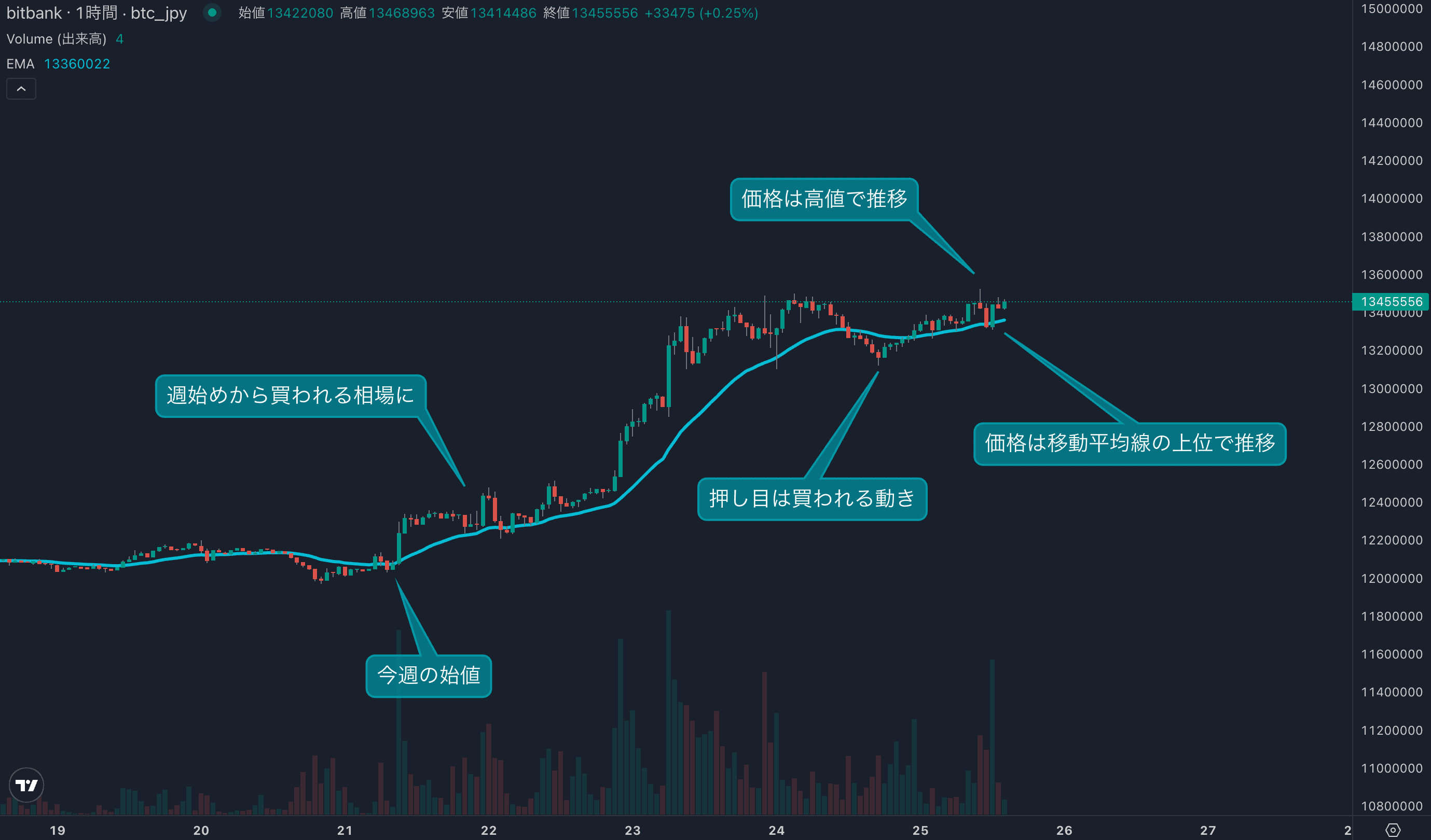 - 今週のビットコインは4月21日の1208万円から取引が始まりました。今週はこれまでの上値が重い相場から一変し、買いが強い相場となりました。火曜日にはトランプ相場以降の上値抵抗を抜け、価格は急騰しました。高値は1352万円を記録し、値幅では約150万円も上昇しました。木曜日には移動平均線(24EMA)を一時的に下回る動きもありましたが、即座に買われ、再度高値を試す動きとなりました。現在は1345万円近辺で取引され、今週の高値圏で推移しています。今週は非常に強い値動きとなり、相場には買いが戻ってきています。