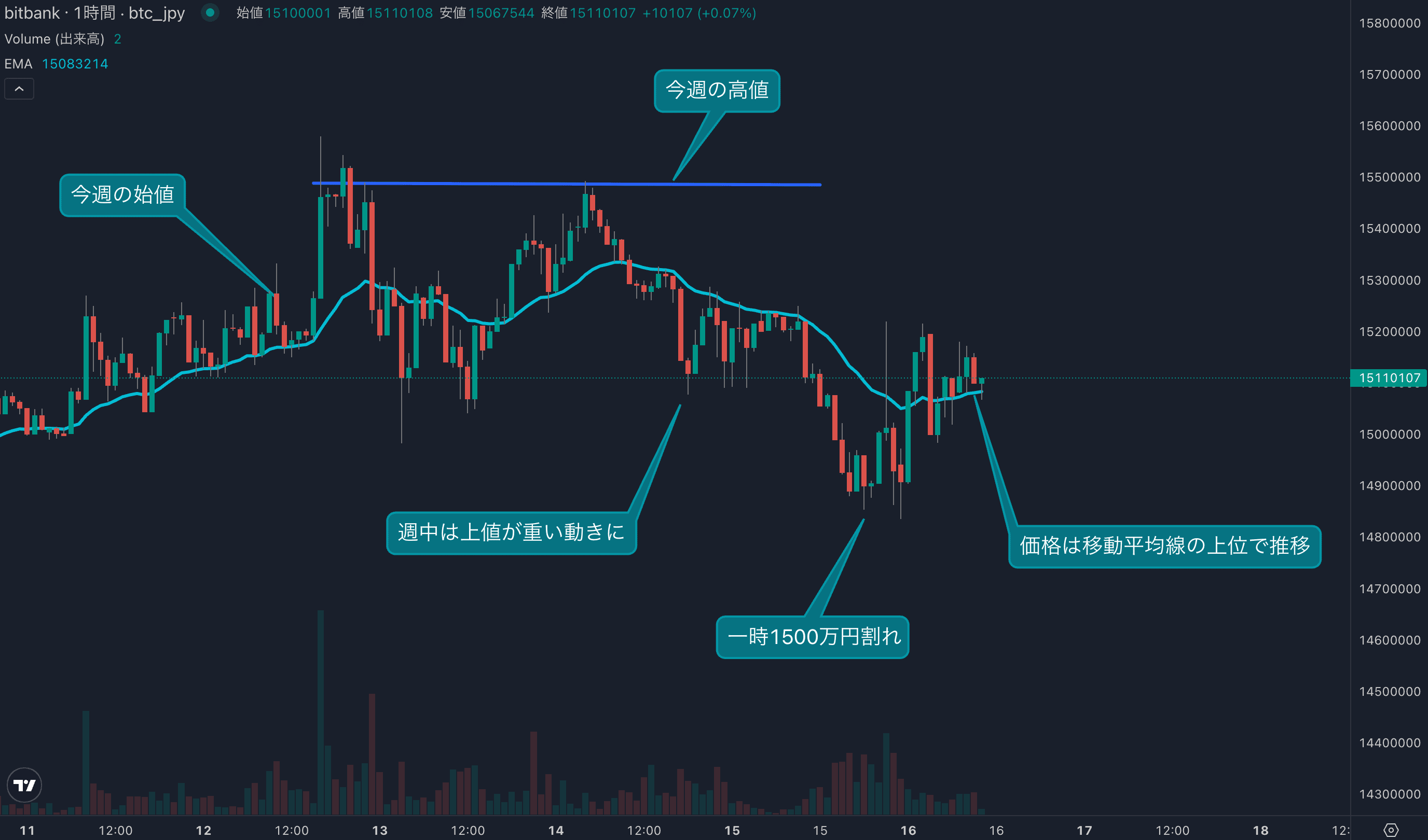 - 今週のビットコインは5月12日の1519万円から取引が始まりました。週前半は上値を追う動きとなり、1550万円近辺まで上昇しました。しかし上値を伸ばすことはできず、週中は下落する動きが強くなりました。木曜日は一時1500万円を割り込む動きが見られました。相場は1500万円より下では買い戻しが入り、現在は24時間移動平均線(24EMA)を上回り、1510万円台で取引されています。週を通じては小幅なマイナスとなっており、調整の1週間となりました。今週マイナスとなれば6週ぶりの陰線となります。