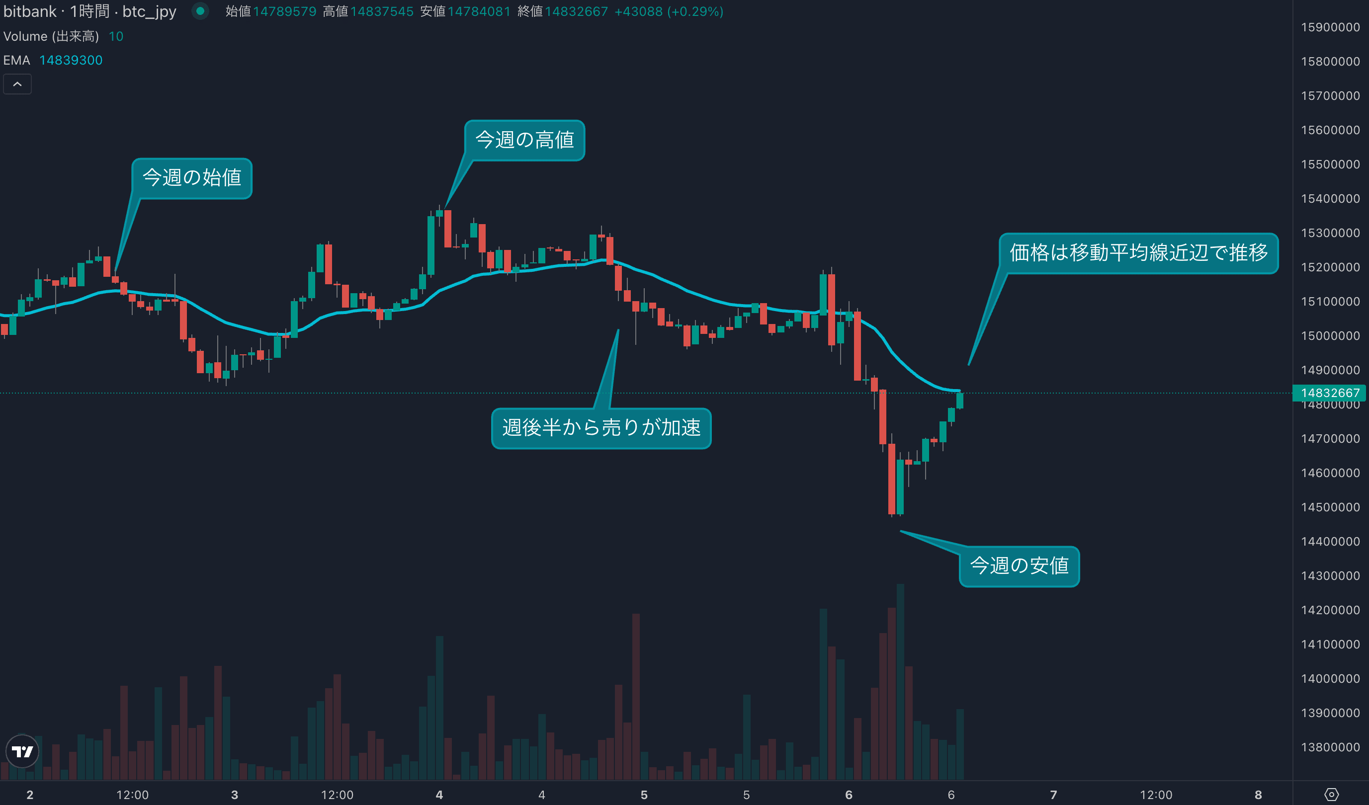 - 今週のビットコインは6月2日の1523万円から取引が始まりました。週始めは揉み合う展開となりました。価格は火曜日に1537万円まで上昇する場面がありましたが、買いは続かず高値を維持することはできませんでした。週後半に入ると逆に売りが強くなり安値を探る動きが見られました。価格は木曜日に1450万円を割り込みました。金曜日に入ると価格は反発し、現在は移動平均線近辺まで価格を戻しています。5月2週目以降の安値を更新しており、短期的には弱気なチャートが形成されています。