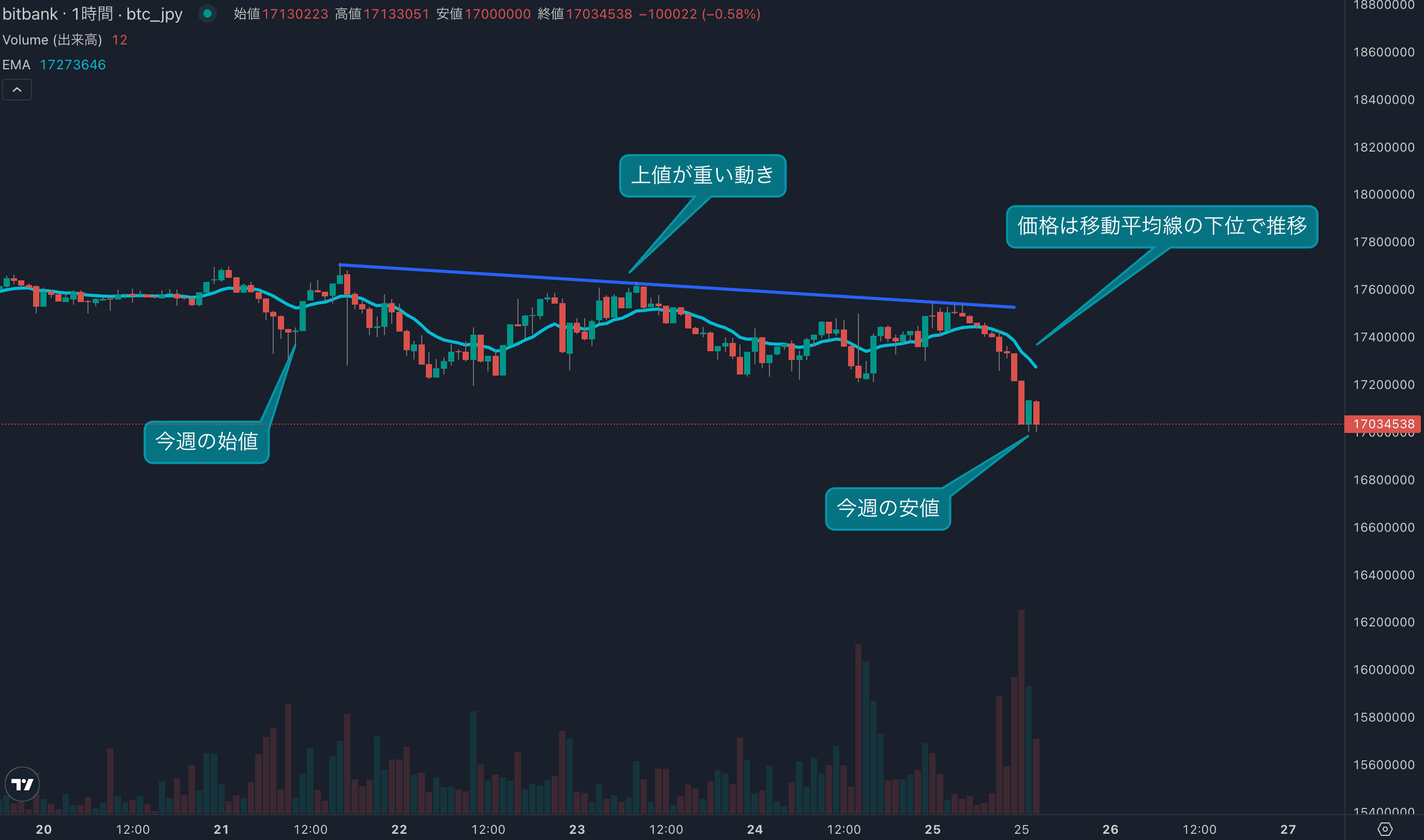 - 今週のビットコインは7月21日の1750万円から取引が始まりました。今週も先週に続き上値が重い展開となりました。徐々に高値を切り下げる弱い動きとなりました。サポートだった1720万円も本日割り込む、現在は1700万円近辺で取引されています。価格が移動平均線(24EMA)を下回り、週末相場に向けて不安が残る展開となりました。今週もマイナスで取引を終えると2週連続の陰線となり、モメンタムが弱いことを示唆することになります。