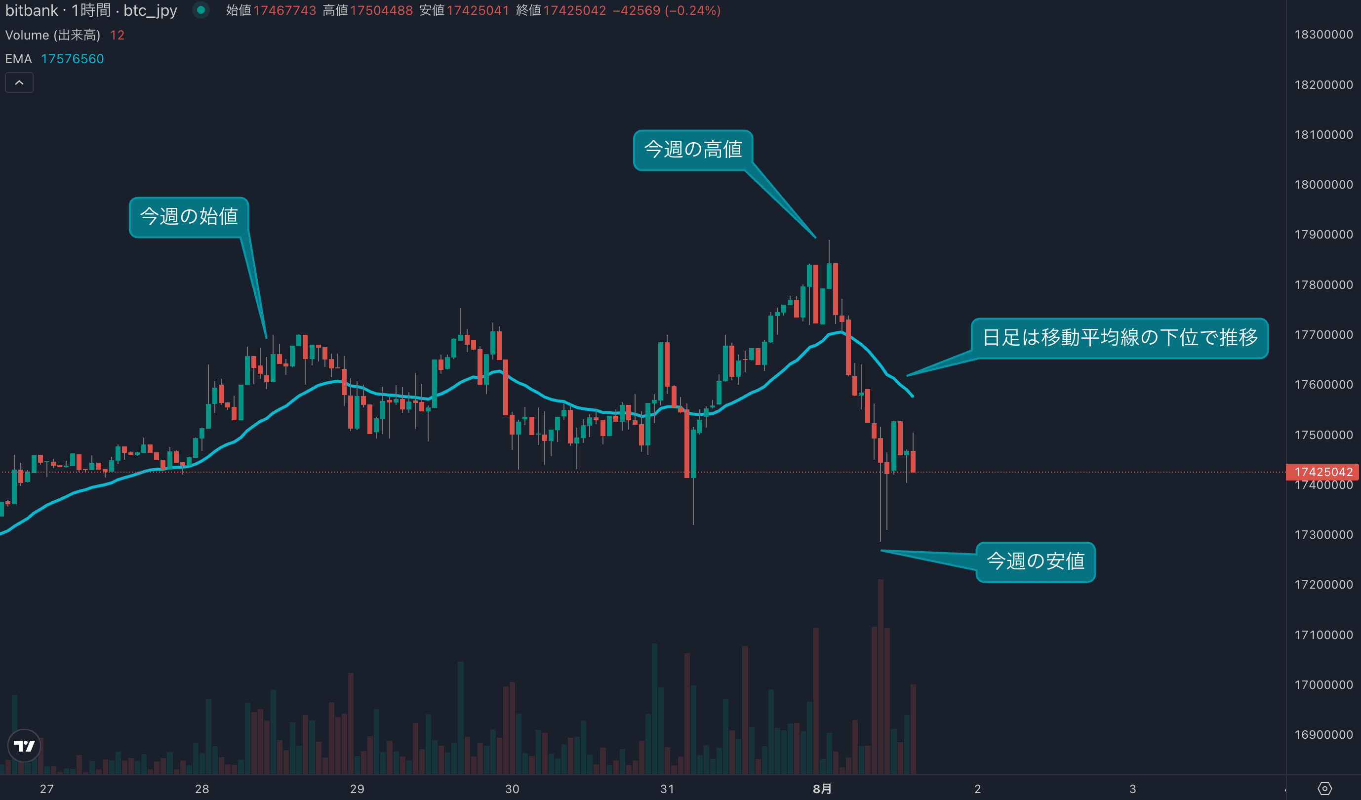 - 今週のビットコインは7月28日の1763万円から取引が始まりました。週始めは1740万円から1770万円のレンジで推移となり、横ばい展開でした。一方週後半に入るとレンジを割り込む動きも見られ、ボラティリティが上昇しました。昨日は1790万円近くまで上昇する場面もありましたが、高値を維持することができず、現在は1740万円近辺で取引され今週の安値圏で推移しています。週後半に入り弱気なチャートとなっており、来週の相場に不安を残す形となっています。
