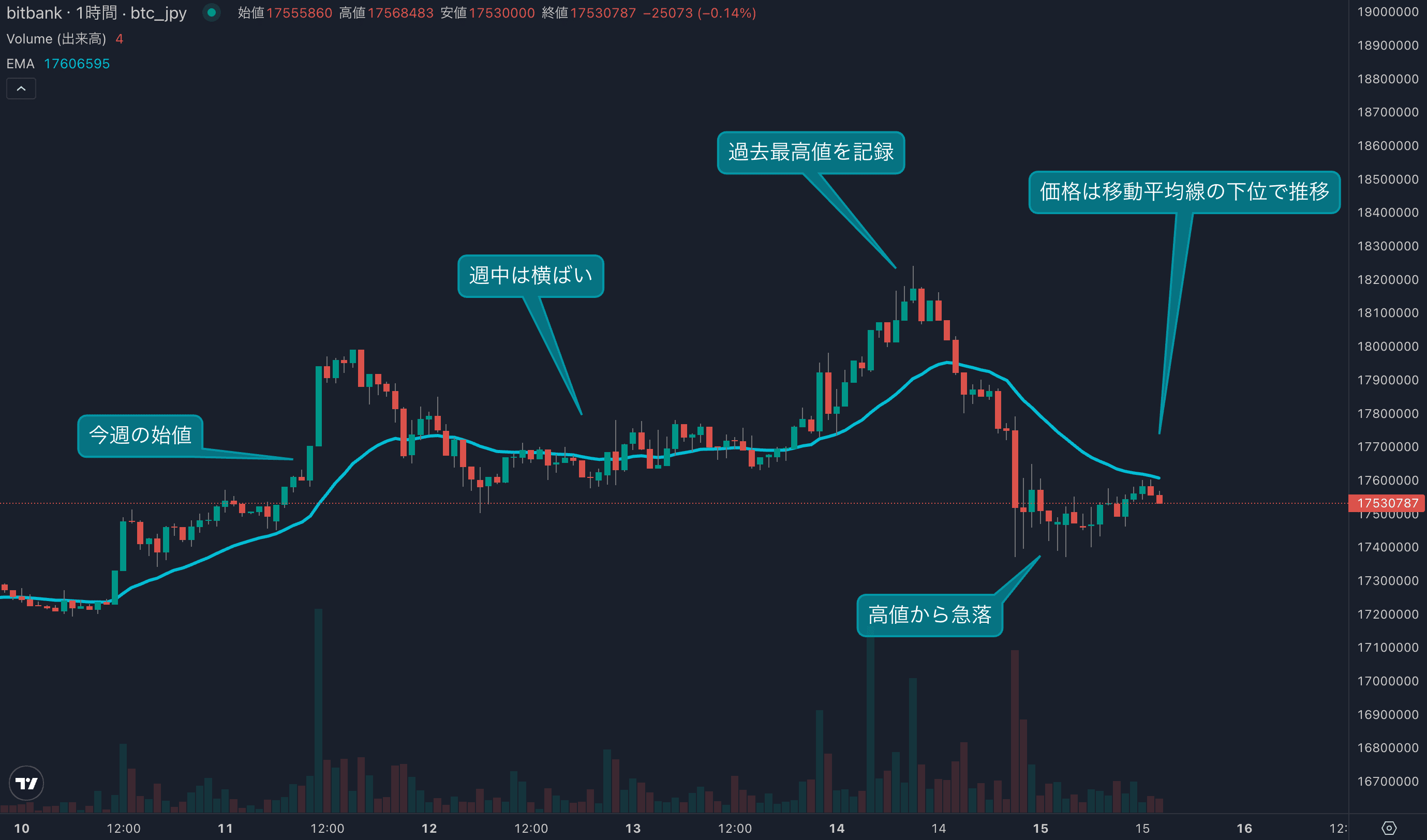 - 今週のビットコインは8月11日の1761万円から取引が始まりました。週前半は底堅い動きとなり、徐々に安値を切り上げる展開でした。水曜日には過去最高値となる1824万円を記録しました。強い相場が続くと見られましたが、木曜日はアメリカの経済指標が上振れたことで、金融市場全体が売られました。現在の価格も24時間移動平均線(24EMA)を下回っており弱い値動きで週の後半を迎えています。週次でもマイナスで推移しています。