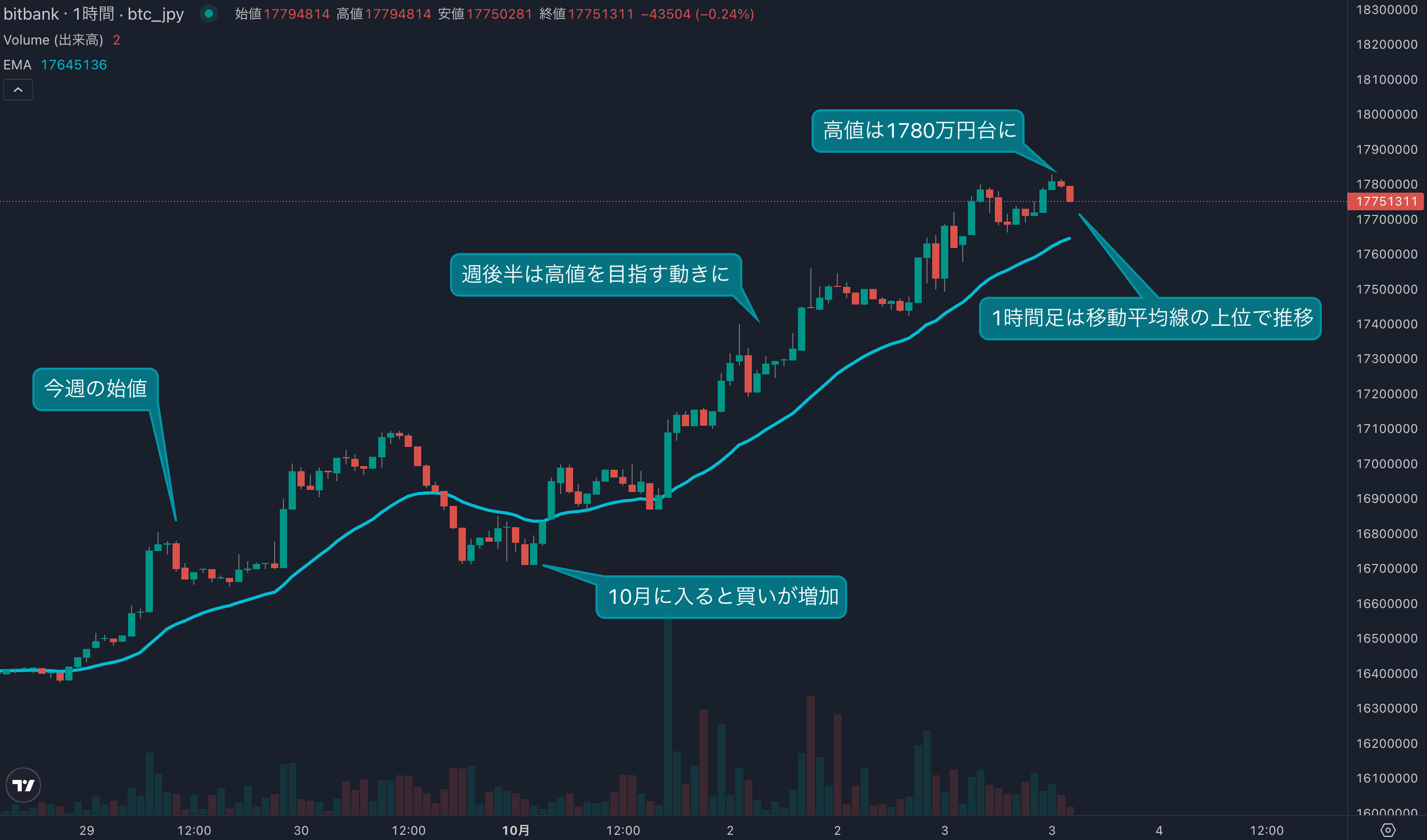 - 今週のビットコインは9月29日の1676万円から取引が始まりました。今週は水曜日から10月相場に入ると買いが増加し、相場は上向きで推移し始めました。週後半は明確に買いが強い相場となり1700万円台を回復し、先月の高値も更新しました。今週の高値は1782万円となり、約2ヶ月ぶりの高値となりました。現在も1時間足は移動平均線(24EMA)を上回り、強い値動きとなっています。昨年も10月、11月の相場強い値動きが見られ、今年も年末に向けて上昇相場が来ることを期待する展開となっています。
