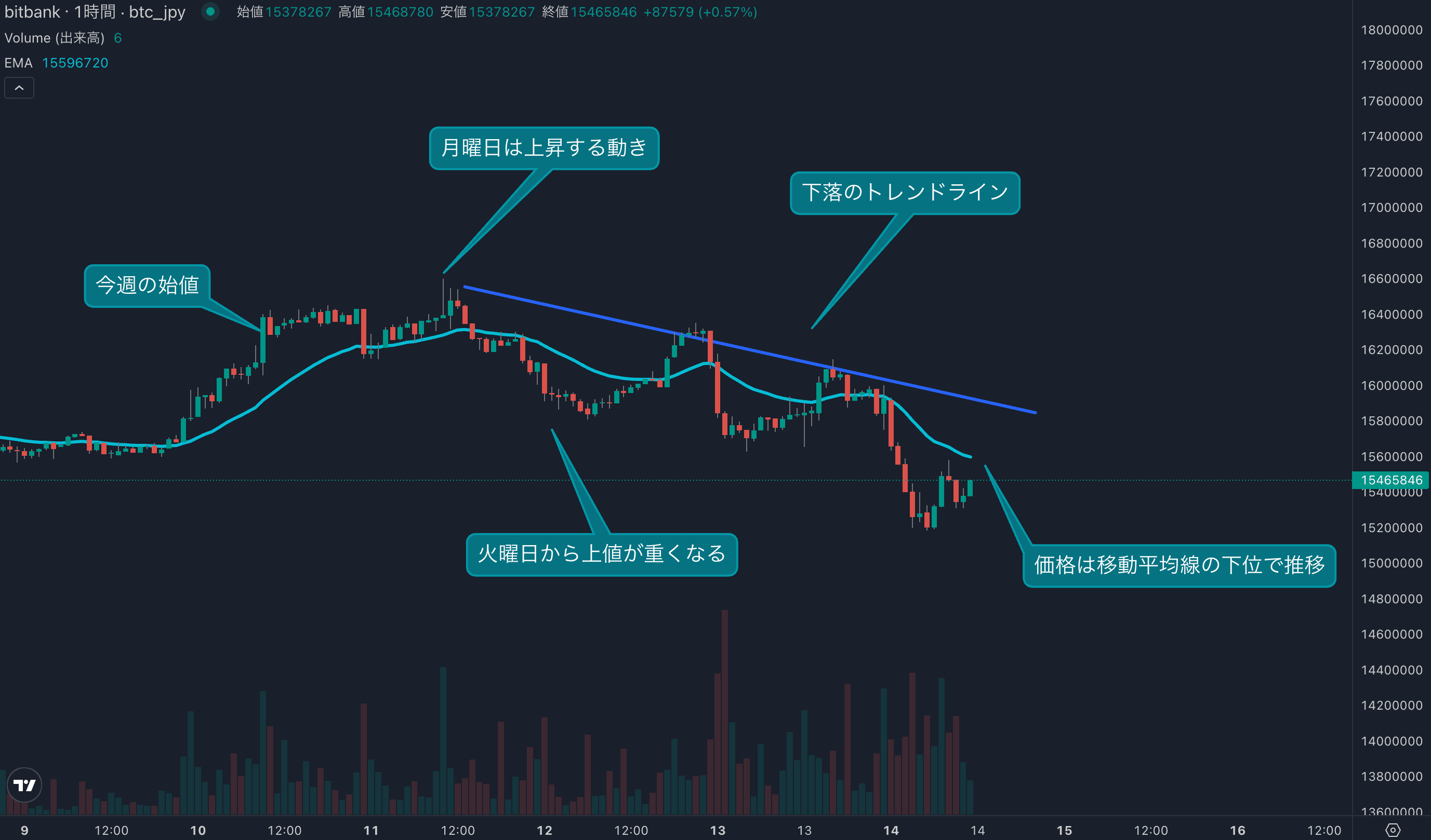 - 今週のビットコインは11月10日の1612万円から取引が始まりました。月曜日に買われる動きとなり相場は1640万円台まで上昇しました。一方、火曜日からは上値が重い展開となり、上値を追う相場にはなりませんでした。足元では下落のトレンドラインが形成されており、このラインを超えるまでは下落方向への動きに警戒です。価格は現在も24時間移動平均線(24EMA)を下回り、弱気の値動きとなっています。今週もマイナスとなると3週連続の陰線を記録します。相場には反転するだけの強い買いは戻っていない状況です。