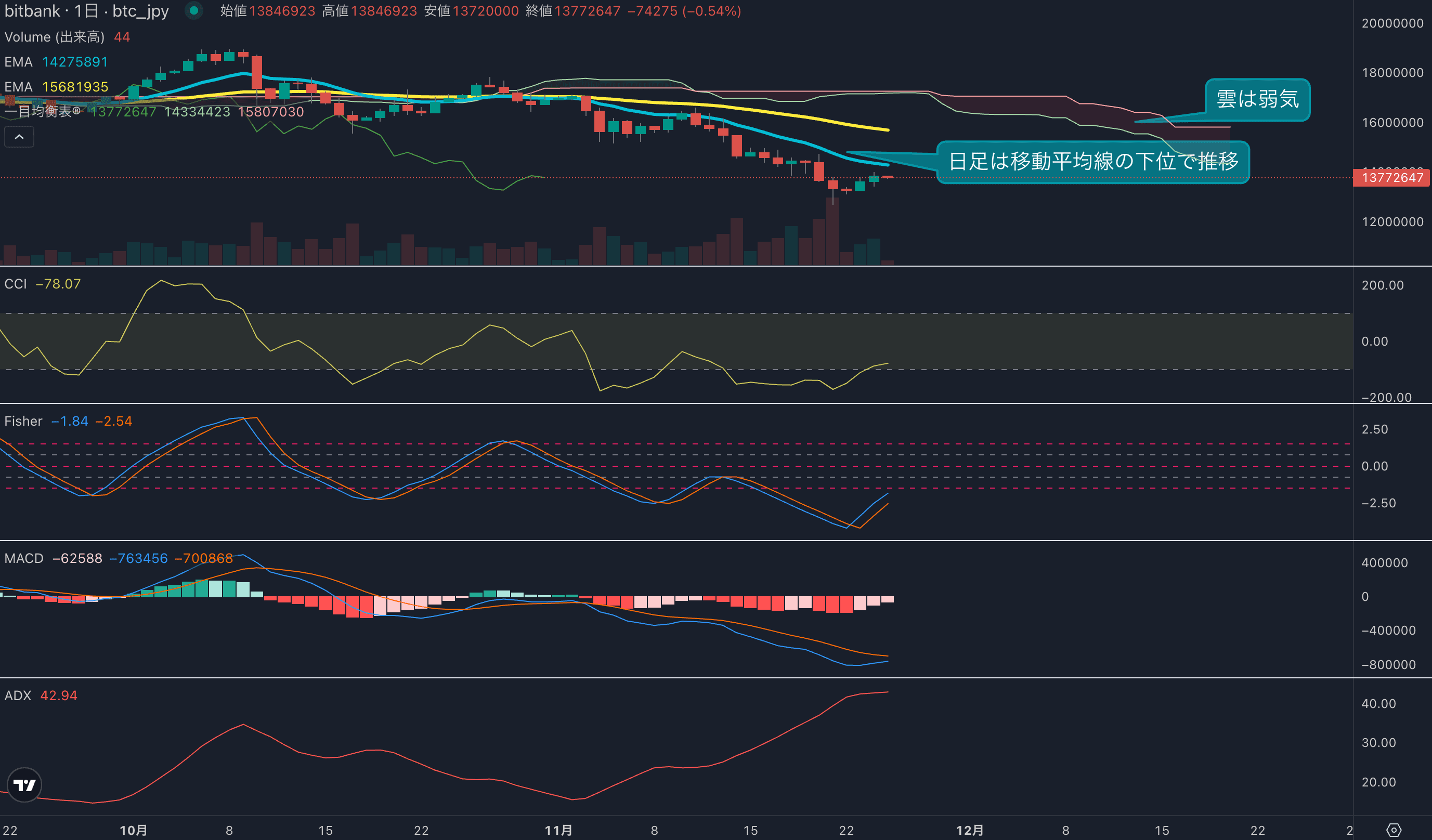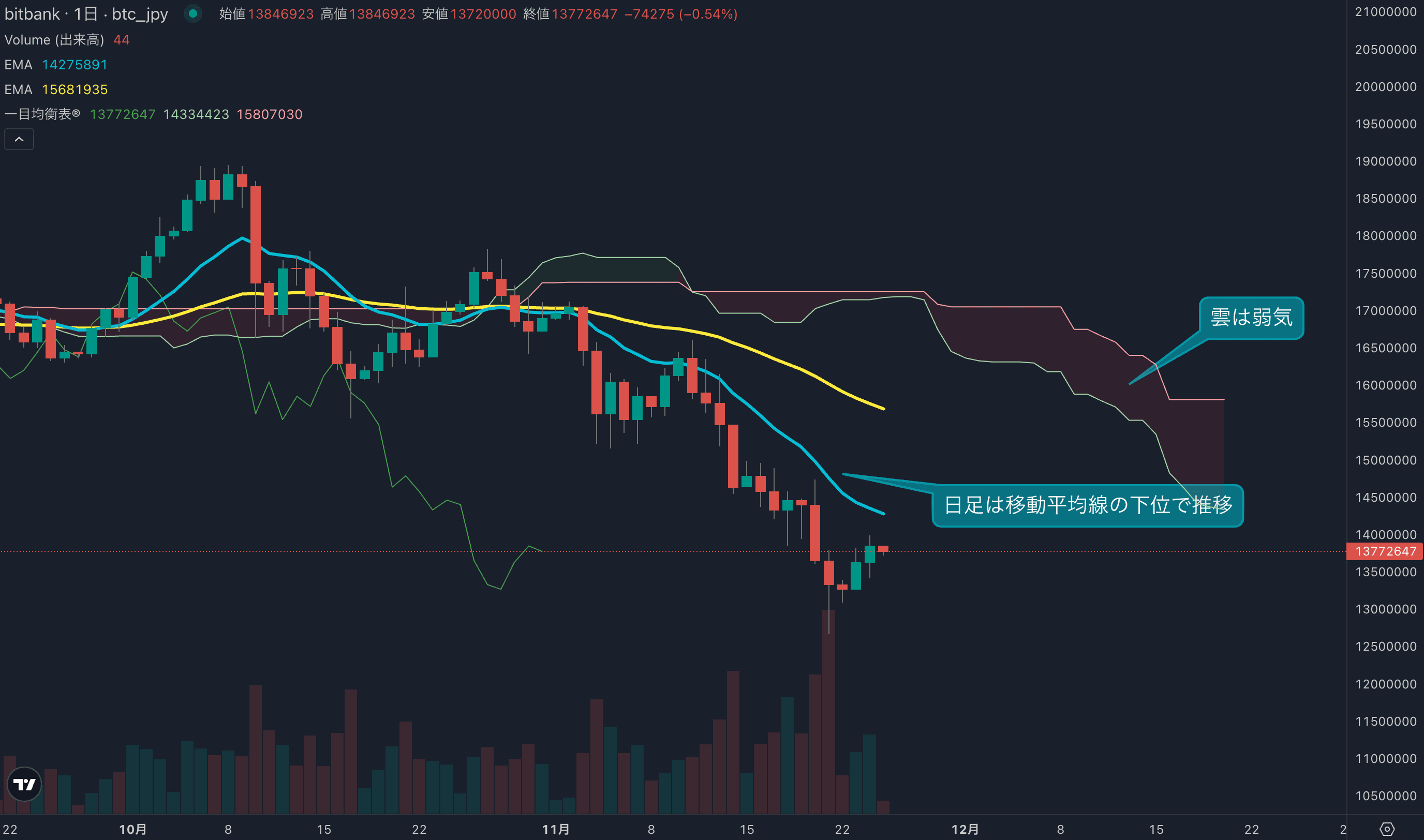 - 価格は14EMA(1435万円)を下回り弱気示唆です。53EMA(1575万円)は下落傾向で、長期トレンドも弱気です。一目均衡表の雲は先行スパン1(1436万円)が先行スパン2(1580万円)を下回り弱気示唆です。