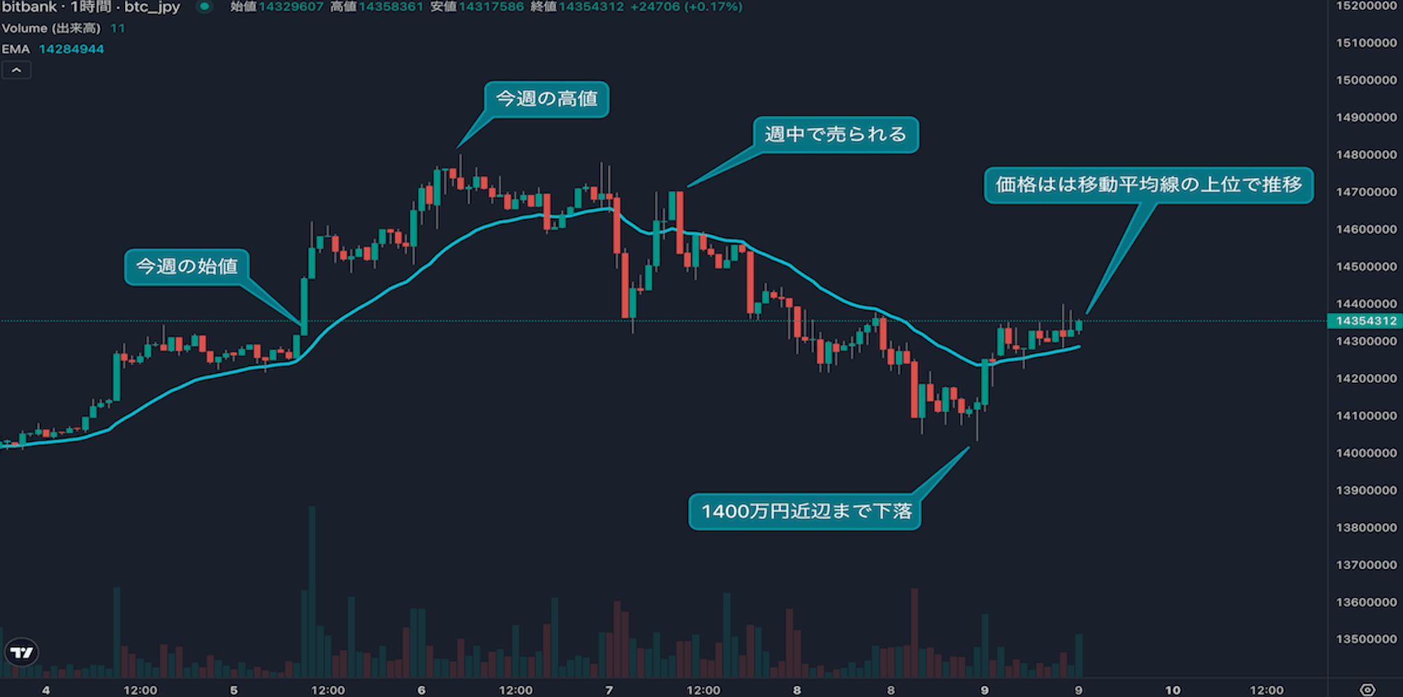 - 今週のビットコインは1月5日の1431万円から取引が始まりました。2026年の初週でしたが、週始めから買われる動きとなりました。価格は一時1470万円台まで上昇しましたが、買いは続かず週中からは売りに押される動きとなりました。昨日は1403万円まで下落し、売り込まれました。一方、8日の取引終了にかけては買い戻され、現在も移動平均線(24EMA)を上回っています。今週は上下に動く相場となり、年初は様子見相場となりました。週末は足元の移動平均線の上位をキープできるか注目です。