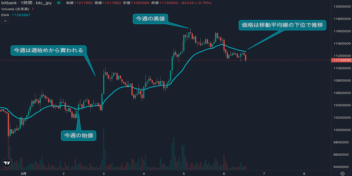 - 今週のビットコインは3月2日の1031万円から取引が始まりました。3月の初週ということもあり前半から買いが入りました。水曜日には1160万円台まで上昇し、4週ぶりの高値を更新しました。一方、週後半は高値が重くなる動きとなり、現在は24時間移動平均線(24EMA)を下回る動きとなっています。週足としては7週ぶりの陽線を記録する可能性があります。一方、これまでの下落トレンドが反転するには、今週の高値を更新する必要があります。上昇トレンドへの回帰を予想するにはまだ早い状況です。